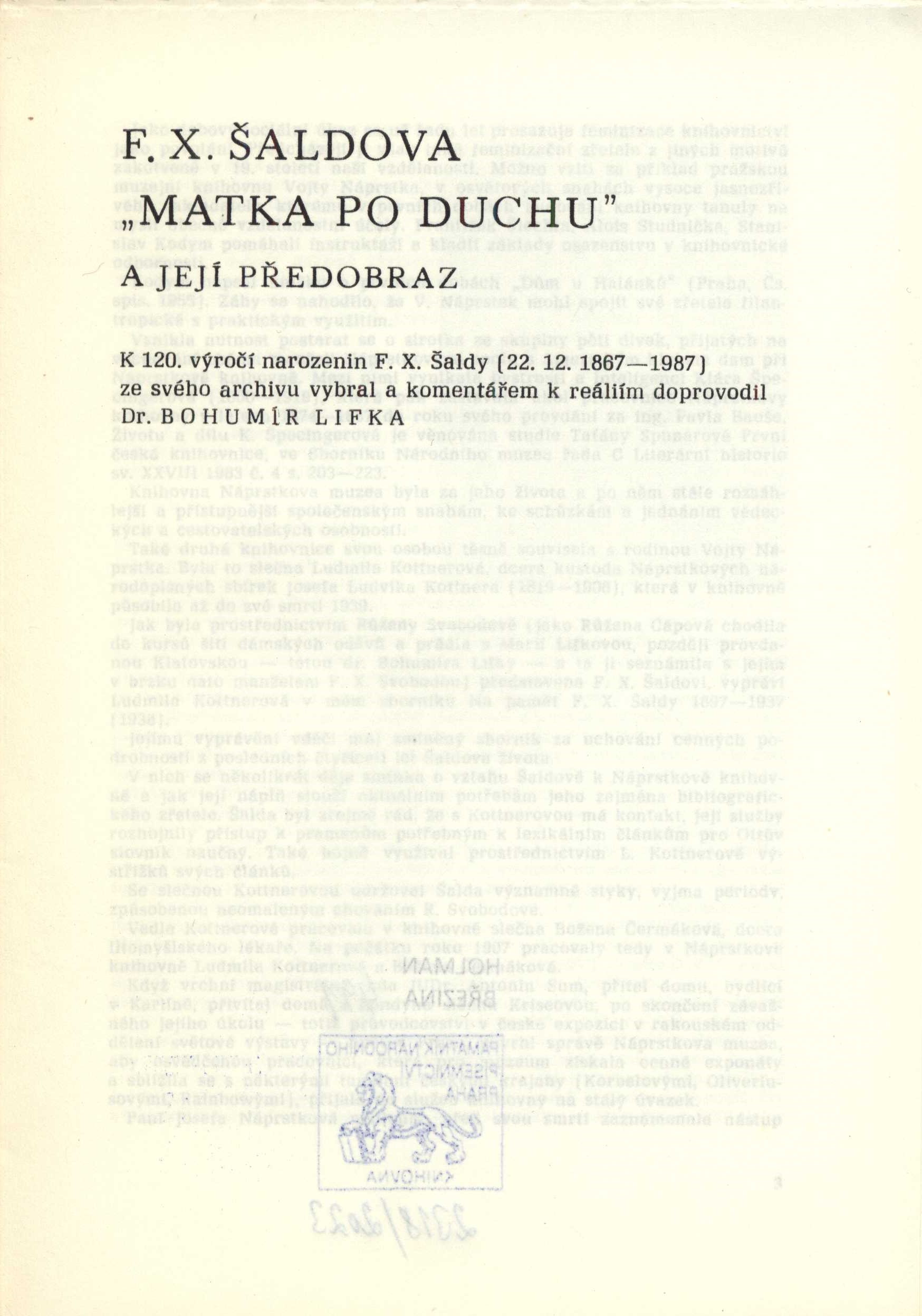 Title information F.X. Šaldova "Matka po duchu" a její předobraz : k 120. výročí narozenin F.X. Šaldy (22.12.1867-1987) ze svého archivu vybral a komentářem k reáliím doprovodil Dr. Bohumír Lifka ; dvěma orig. rytinami podle předlohy Vojtěcha Cinybulka doprovodil zasl. umělec Josef Herčík Další autoři Lifka, Bohumír, 1900-1987 (Compiler) (Commentator) Herčík, Josef, 1922-1999 (Artist) (Engraver) Corporation Spolek českých bibliofilů v Praze (Publisher) Publication [Praha] : Spolek českých bibliofilů, 1988 Scope 15 stran : ilustrace, portréty, faksimile ; 22 cm + 1 příloha Personal subjects Šalda, F. X., 1867-1937 - výtvarný a literární kritik, estetik, básník, dramatik, překladatel, pedagog, redaktor * Kriseová, Marie, 1875-1947 - knihovnice a úřednice, přítelkyně F.X. Šaldy Keywords čeští spisovatelé * čeští básníci * literární kritici * knihovnice * Česko * stol. 19.-20. * studie * korespondence Copy cnt. 1, currently available 1 Document kind monografie Call number Holman-Březina 0491