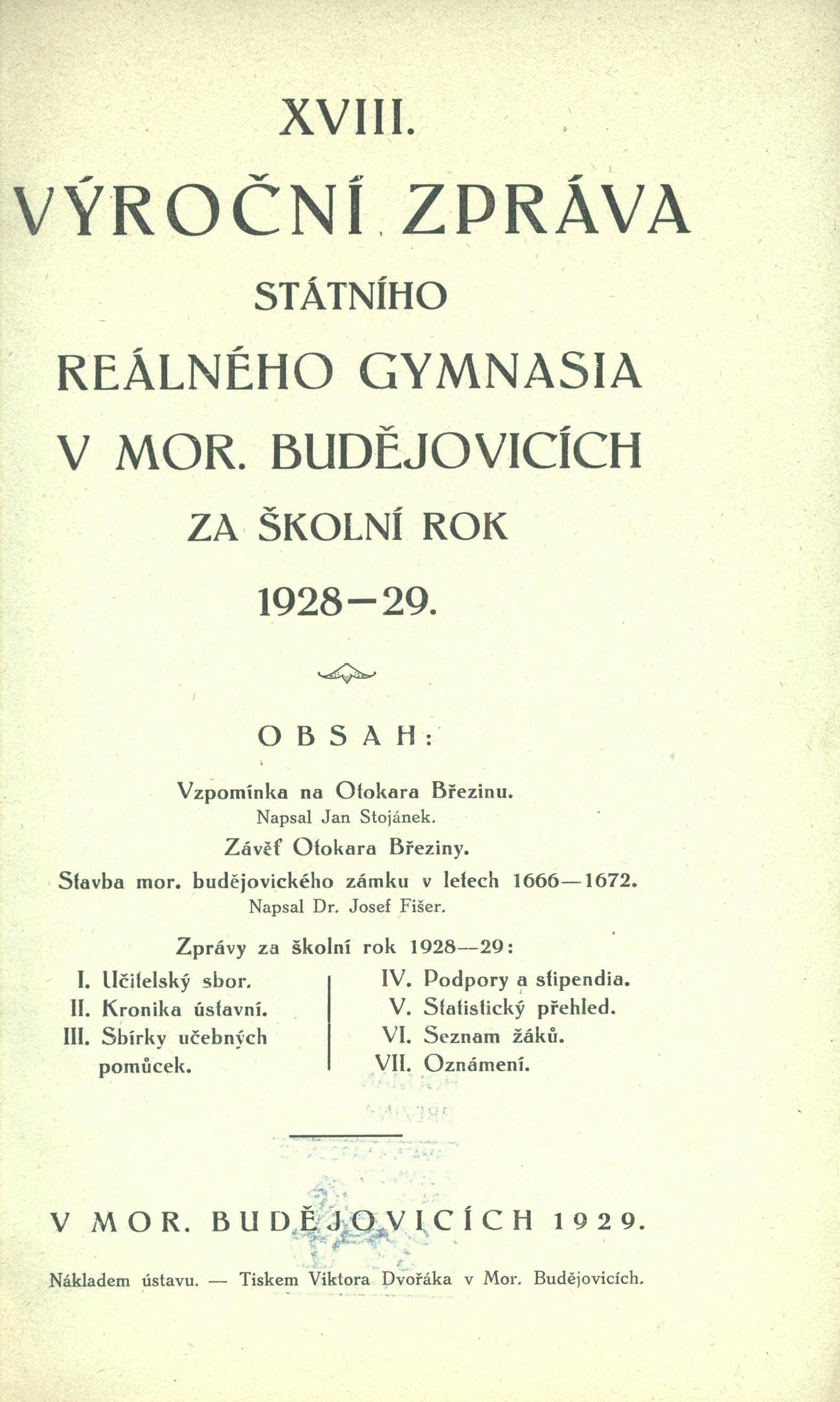XVIII. výroční zpráva státního reálného gymnasia v Mor. Budějovicích : za školní rok 1928-29. -- V Mor. Budějovicích : nákladem ústavu, 1929. -- Tiskem Viktora Dvořáka. -- 53 stran : ilustrace, faksimile ; 23 cm. -- Zdobená obálka. - Obsah. - Černobílé fotografie, ilustrace a faksimile s popiskami. - Tabulky. - Ex libris. - Poznámky pod čarou. -- Obsahuje bibliografické odkazy. -- Contains also: Vzpomínka na Otokara Březinu / Jan Stojánek -- Závěť Otokara Březiny. -- ISBN : (Brožováno).