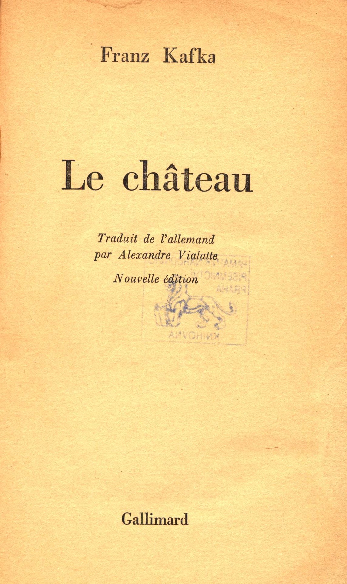 Title information Le château / Franz Kafka ; traduit de l´allemand par Alexandre Vialatte Personal name Kafka, Franz, 1883-1924 (Translator) Další autoři Vialatte, Alexandre, 1901-1971 (Translator) (Author of introduction) Corporation Gallimard (firma) (Publisher) Bussière (firma) (Printer) Edition statement Nouvelle édition Publication [Paris] : Gallimard, 1972 Manufacture Saint-Amand (Cher) : Imprimerie Bussière Copyright notice date ©1965 Scope 530 stran ; 18 cm ISBN (Brožováno) Edition Collection Folio, (Gallimard) ; 284
