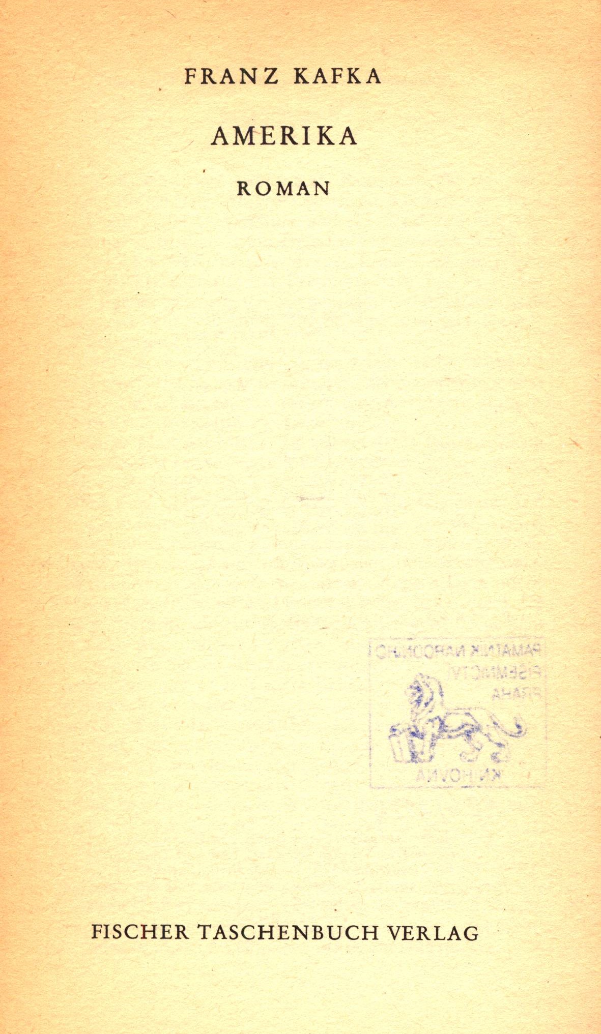 Title information Amerika : Roman / Franz Kafka Personal name Kafka, Franz, 1883-1924 (Author) Další autoři Brod, Max, 1884-1968 (Author of afterword, colophon, etc.) Corporation S. Fischer Verlag (nakladatelství) (Publisher) Hanseatische Druckanstalt GmbH (tiskárna) (Printer) Edition statement Ungekürzte Ausgabe Publication Frankfurt am Main : Fischer Taschenbuch Verlag, [1960-1990] Manufacture Hamburg : Hanseatische Druckanstalt GmbH Scope 234 stran ; 18 cm ISBN 3-436-00143-0 (brožováno) Country Germany Language German Note Obálka zdobená obrázkem Franze Kafky. - Na rubu nakladatelského listu s logem poznámka o knize a autorovi. - Doslov Maxe Broda. - Rok vydání neuveden