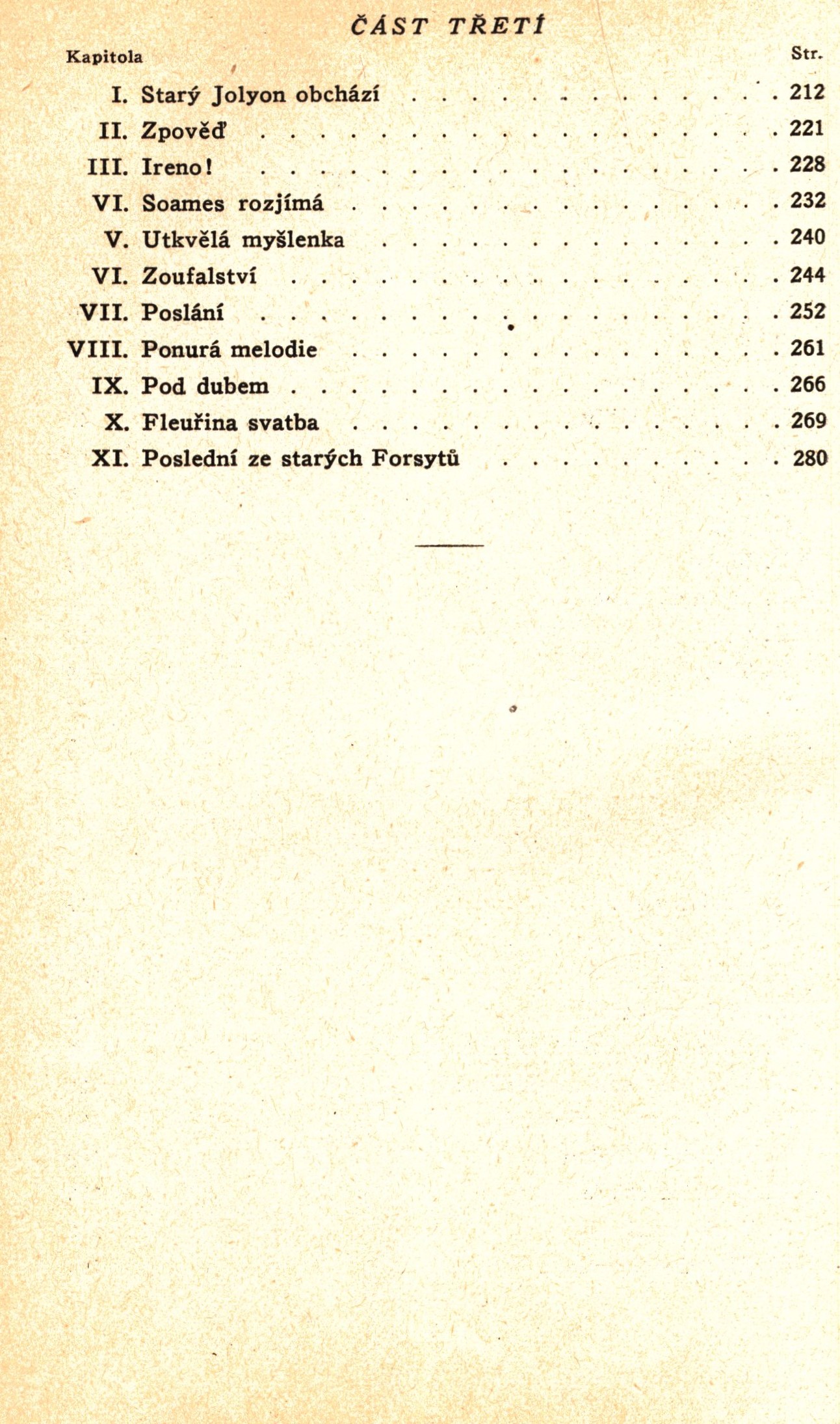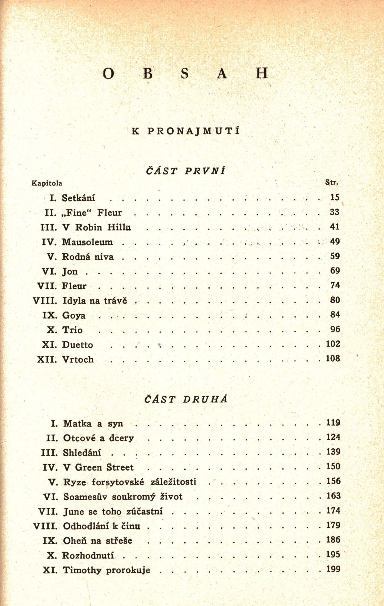Názvové údaje K pronajmutí : Sága rodu Forsytů III / John Galsworthy ; přeložila B. Kubertová-Zátková ; obálku navrhl Josef Čapek Osobní jméno Galsworthy, John, 1867-1933 (Autor) Další autoři Kubertová-Zátková, Bohumila, 1883-1971 (Překladatel) Čapek, Josef, 1887-1945 (Autor obálky) Korp. Dr. Ot. Štorch-Marien (nakladatelství) (Nakladatel, vydavatel) Orbis (tiskárna) (Tiskař) Údaje o vydání II. vydání Nakladatel V Praze : Aventinum, 1930 Výrobce V Praze : Orbis Rozsah 291 stran : 22 cm ISBN (vázáno) Edice Standard Library, anglo-americká knihovna (Aventinum, Ot. Štorch-Marien) Země vyd. Česko Jazyk dok. čeština Jazyk orig. angličtina Poznámky Polokožená purpurová obálka se zlatou ražbou. - Zlacená ořízka. - Černobílý titulní list. - Obsah. - Tiráž.