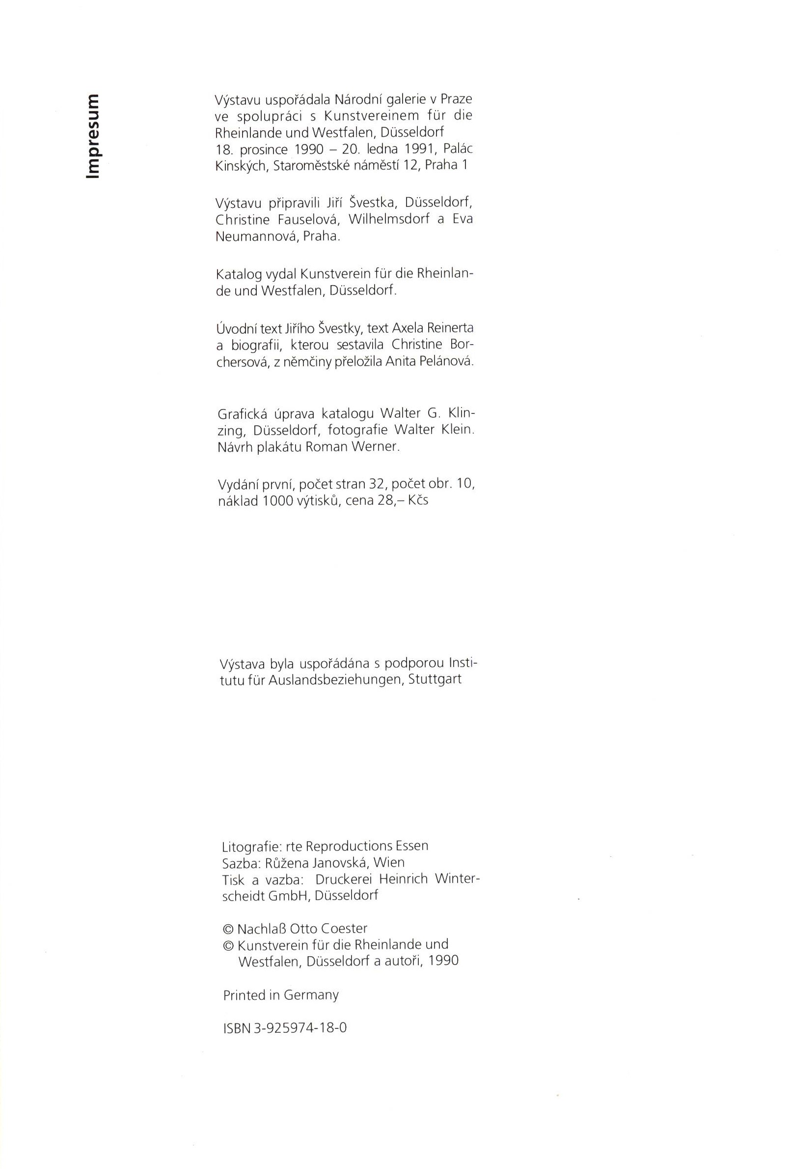 Note Výstavu uspořádala Národní galerie v Praze - palác Kinských 18.12.1990 - 20.1.1991, ve spolupráci s Kunstverein für die Rheinlande und Westfalen, Düsseldorf. - Obálka se záložkami. - Černobílé reprodukce z díla O. Coestera