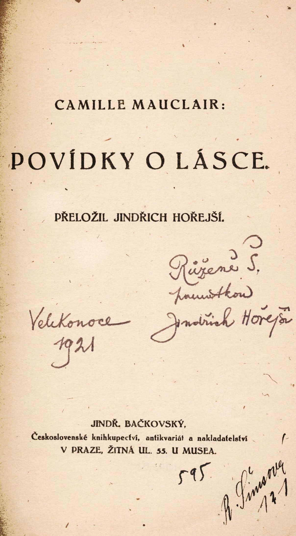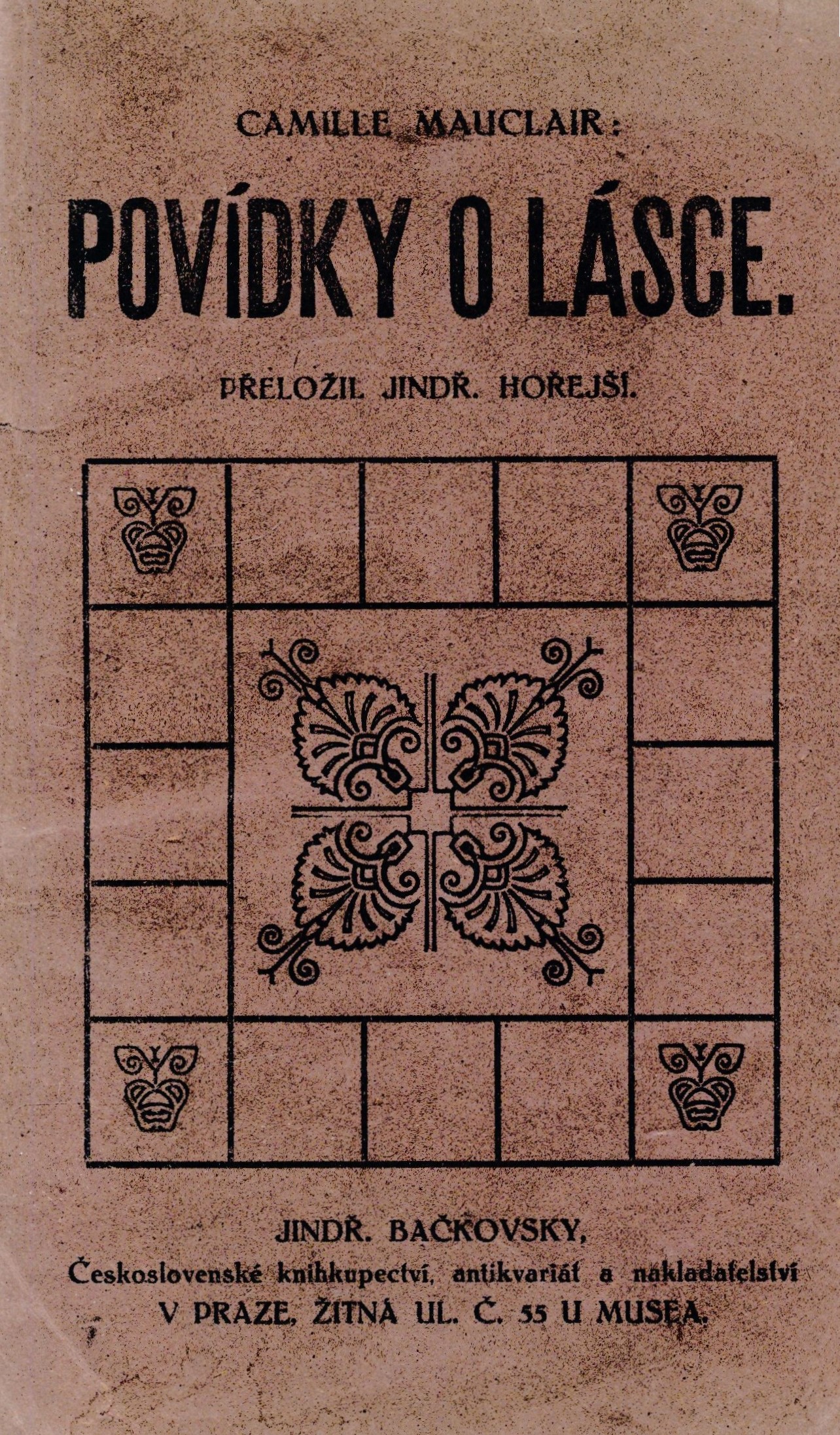 Title information Povídky o lásce / Camille Mauclair ; přeložil Jindřich Hořejší Personal name Mauclair, Camille, 1872-1945 (Author) Další autoři Hořejší, Jindřich, 1886-1941 (Translator) (Dedicator) Hořejší, Růžena, 1899- (Dedicatee) (Inscriber) Corporation Jindř. Bačkovský, Československé knihkupectví, nakladatelství a antikvariát (Publisher) František Rebec (nakladatelství, tiskárna, knihkupectví) (Printer) Publication V Praze : Jindř. Bačkovský, 1921 Manufacture V Praze : Fr. Rebec Scope 50 stran ; 19 cm ISBN (vázáno) Country Czech Republic Language Czech Language of the original French Note Obálka zdobená ornamentálním dekorem. - Černobílý titulní list. - Na konci nakladatelská inzerce.