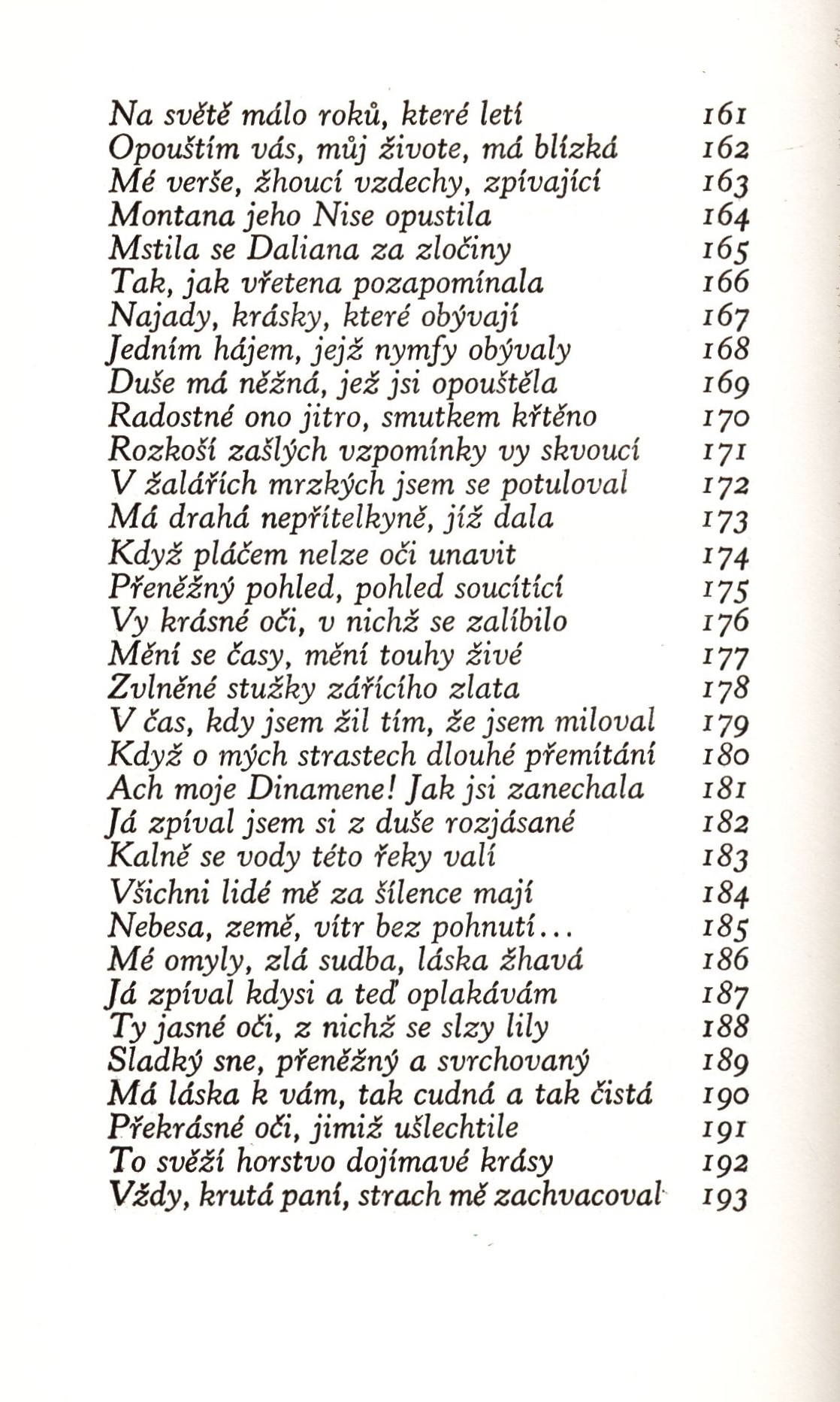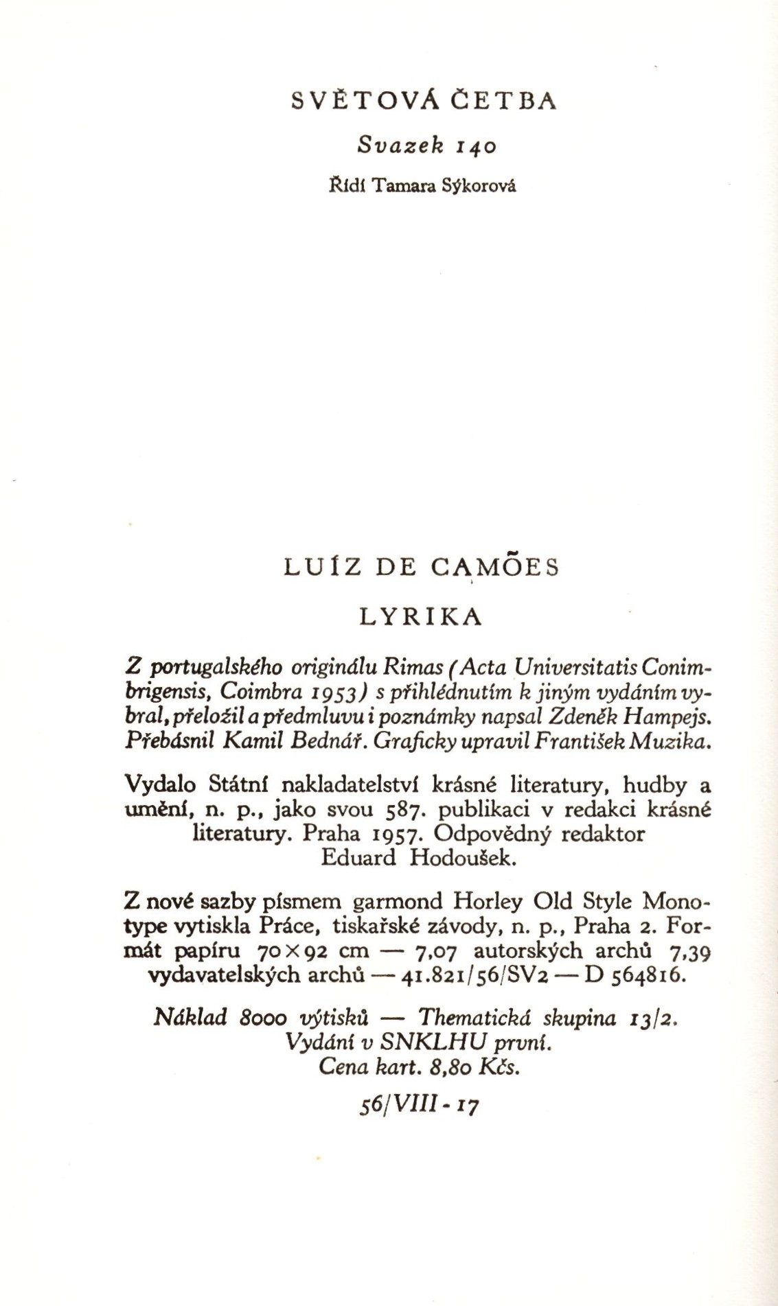 Title information Lyrika / Luís de Camões ; přeložil a předmluvu i poznámky napsal Zdeněk Hampejs ; přebásnil Kamil Bednář ; graficky upravil František Muzika Personal name Camões, Luís de, asi 1524-1580 (Author) Další autoři Hampl, Zdeněk, 1929-1986 (Author of introduction) (Translator) Bednář, Kamil, 1912-1972 (Adapter) Muzika, František, 1900-1974 (Book designer) Corporation Státní nakladatelství krásné literatury, hudby a umění (Publisher) Práce (tiskárna) (Printer) Publication V Praze : Státní nakladatelství krásné literatury, hudby a umění, 1957 Manufacture V Praze : Práce, tiskařské závody, n. p. Scope 256 stran ; 17 cm ISBN (vázáno) Edition Světová četba, (Státní nakladatelství krásné literatury, hudby a umění) svazek 140