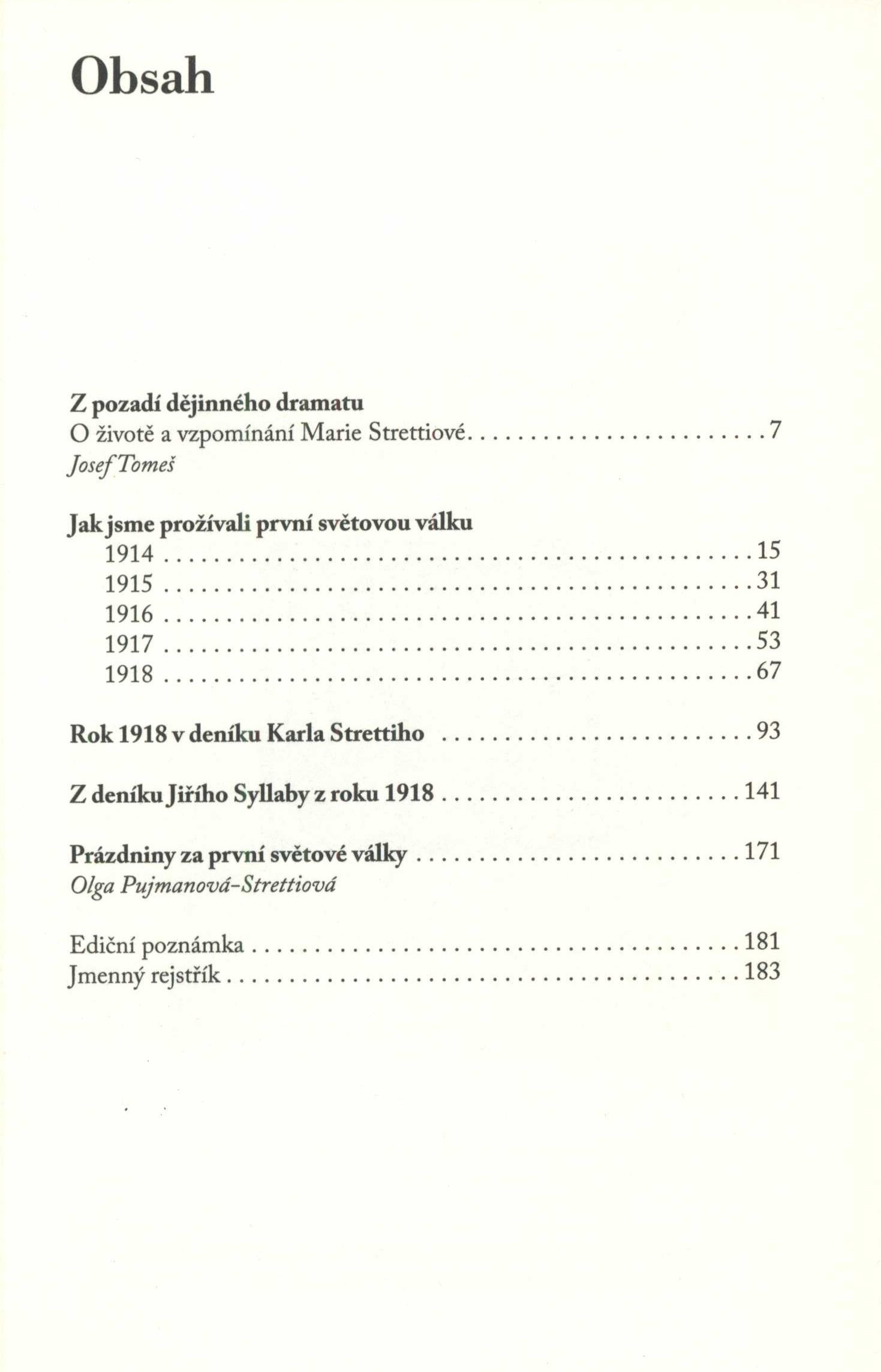 Anotace Vzpomínky pravnučky Josefa Jungmanna na každodenní život v průběhu první světové války. Práce obsahuje rovněž deníkové zápisky autorčina syna Karla Strettiho a jeho přítele Jiřího Syllaby věnované událostem roku 1918. První světová válka vykolejila život milionů lidí. Šokovala množstvím padlých a dotud nepoznanými hrůzami na bojištích i dlouhodobým strádáním v zázemí, bídou, hladem i politickou persekucí. Rychle pohřbila iluze o věku vrcholné civilizace, pokroku a humanity, s nimiž sebevědomé lidstvo vstupovalo do 20. století, a naopak vyvolala barbarství a temné síly. Tvrdě poznamenala i český národ: vyžádala si od něho tisíce obětí za cizí věc, ale zároveň mu přinesla naději na úspěšné završení jeho mnohaletého zápasu za politickou a státní suverenitu. Ani uprostřed válečných poměrů se v českém zápolí nezastavil každodenní život, sestávající z pravidelných, všedních činností, soukromých starostí i radostí, osobních citových prožitků a vzplanutí. Jako dříve chodili lidé do zaměstnání či do škol, starali se o rodiny i domácnosti, navštěvovali divadelní představení, koncerty a výstavy, četli nejrůznější literární díla, jezdili na prázdninové letní byty. Zdánlivě normální život ovšem plynul ve stínu povolávacích rozkazů a zásobovacích problémů, ale také pod dojmem šeptaných zpráv o úspěších československého zahraničního odboje. A právě tuto českou (a specificky pražskou) válečnou každodennost autenticky a plasticky zpřítomňuje memoárové dílo Marie Strettiové Jak jsme prožívali první světovou válku, jež se po pětasedmdesáti letech od svého vzniku konečně dočkalo knižního vydání. Druh dok. monografie Poznámky o skryté bibliografii a rejstřících Obsahuje bibliografické odkazy a rejstřík. Osobní hesla Strettiová, Marie, 1876-1953 - pravnučka Josefa Jungmanna, autorka pamětí Klíčová slova 1. světová válka * každodenní život * dějiny * Česko * r. 1876-1953 * r. 1914-1918 * vzpomínky MDT 94 * 94(100)"1914/1918" * 316.728 * 94(437.3) * 929 * (0:82-94) Signatura Přír.číslo Lokace Info LITb 02099 0525/2024 Sbírka