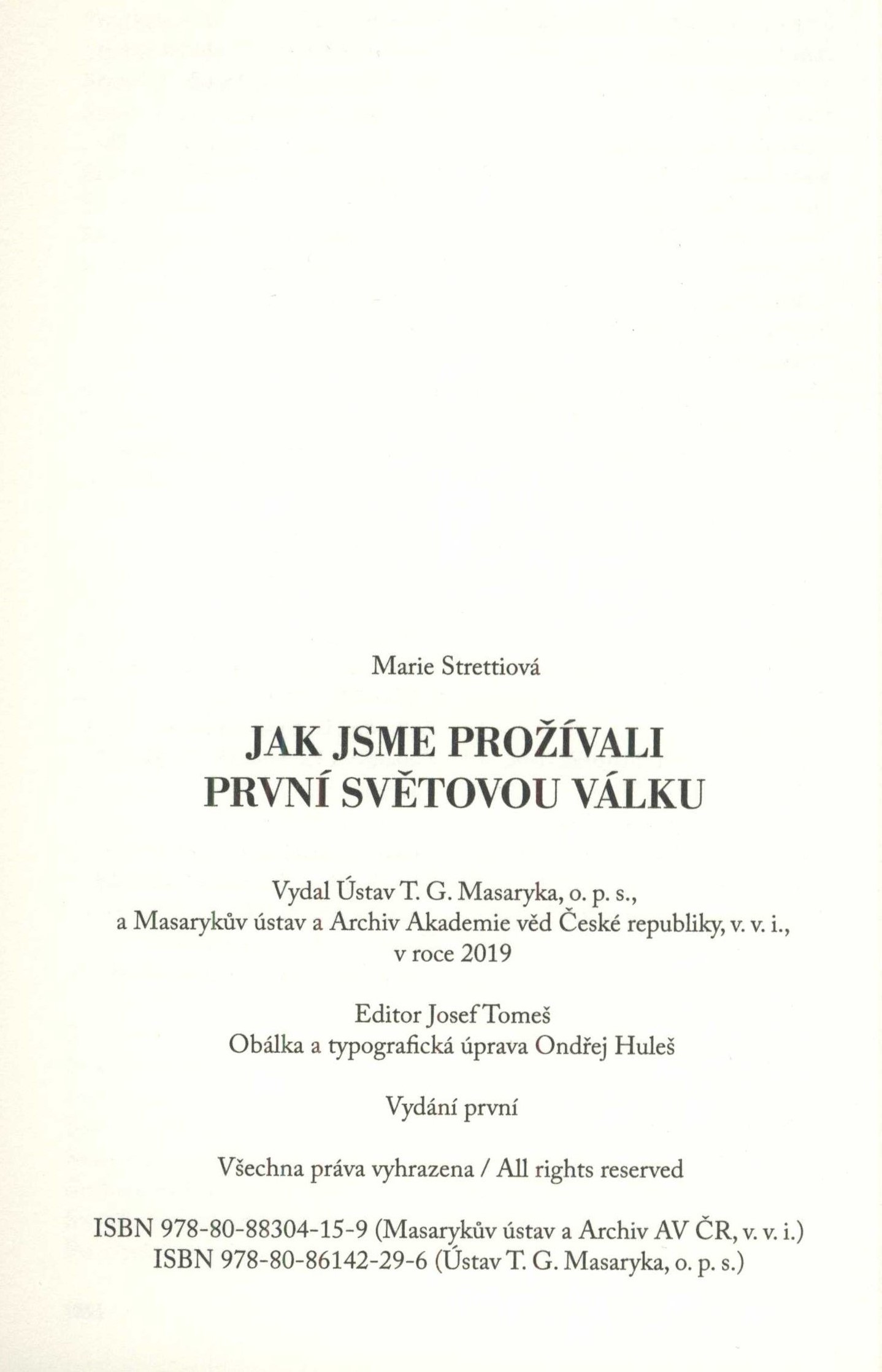 Názvové údaje Jak jsme prožívali první světovou válku / Marie Strettiová ; obálka a grafická úprava Ondřej Huleš Osobní jméno Strettiová, Marie, 1876-1953 (Autor) Další autoři Huleš, Ondřej, 1971- (Autor obálky) (Knižní grafik) Korp. Ústav T.G. Masaryka, o.p.s. (společnost) (Nakladatel, vydavatel) Masarykův ústav a Archiv Akademie věd ČR (Nakladatel, vydavatel) Údaje o vydání Vydání první Nakladatel Praha : Ústav T.G. Masaryka, o.p.s. : Masarykův ústav a Archiv Akademie věd České republiky, v.v.i., 2019 Rozsah 189 stran : ilustrace, portréty, faksimile ; 21 cm ISBN 978-80-88304-15-9 (Masarykův ústav a Archiv AV ČR ; brožováno) 978-80-86142-29-6 (Ústav T.G. Masaryka ; brožováno) Země vyd. Česko Jazyk dok. čeština Poznámky Zdobená barevná obálka. - Na přední záložce obálky anotace knihy. - Frontispis (fotografický portrét autorky). - Obsah. - Černobílé ilustrace, fotografie, portréty a faksimile s popiskami. - Ediční poznámka. - Na zadní záložce obálky bio-bibliografická poznámka o autorce.