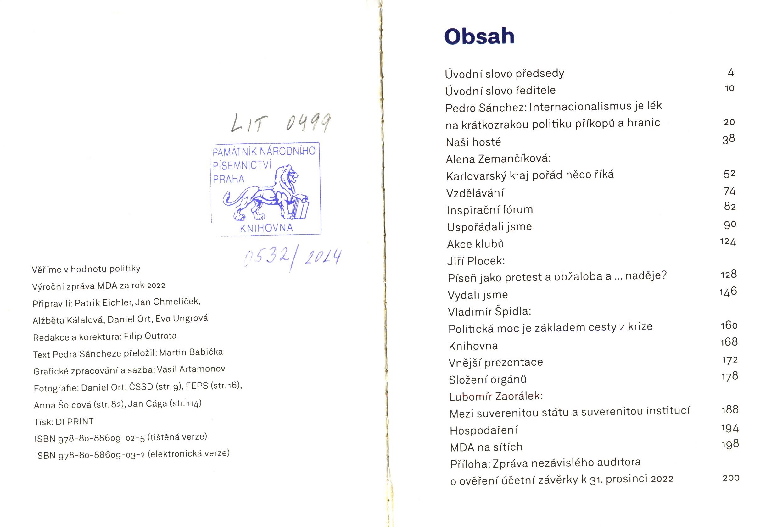Title information Věříme v hodnotu politiky : výroční zpráva Masarykovy demokratické akademie za rok 2022 / Masarykova demokratická akademie ; připravili Patrik Eichler, Jan Chmelíček, Alžběta Kálalová, Daniel Ort, Eva Ungrová ; grafické zpracování a sazba Vasil Artamonov Main entry-corp. Masarykova demokratická akademie (sdružení) (Author) (Publisher) Další autoři Eichler, Patrik, 1984- (Editor) Chmelíček, Jan (Editor) Ort, Daniel (Editor) Artamonov, Vasil, 1980- (Book designer) Publication [Praha] : Masarykova demokratická akademie, [2023] Scope 199 stran : ilustrace, fotografie ; 15 cm ISBN 978-80-88609-02-5 (brožováno) Country Czech Republic Language Czech Document kind monografie Corporate keywords Masarykova demokratická akademie (sdružení) Keywords politické organizace * vzdělávací instituce a organizace * sociální demokracie * výroční zprávy * dokumenty * r. 2022 * Česko UDC 329 * 06.055.5 * 37.091:061 * 32:061 * 329.14 * (047.1) Call number Track No. Location Info LITa 0499 0532/2024 Sbírka