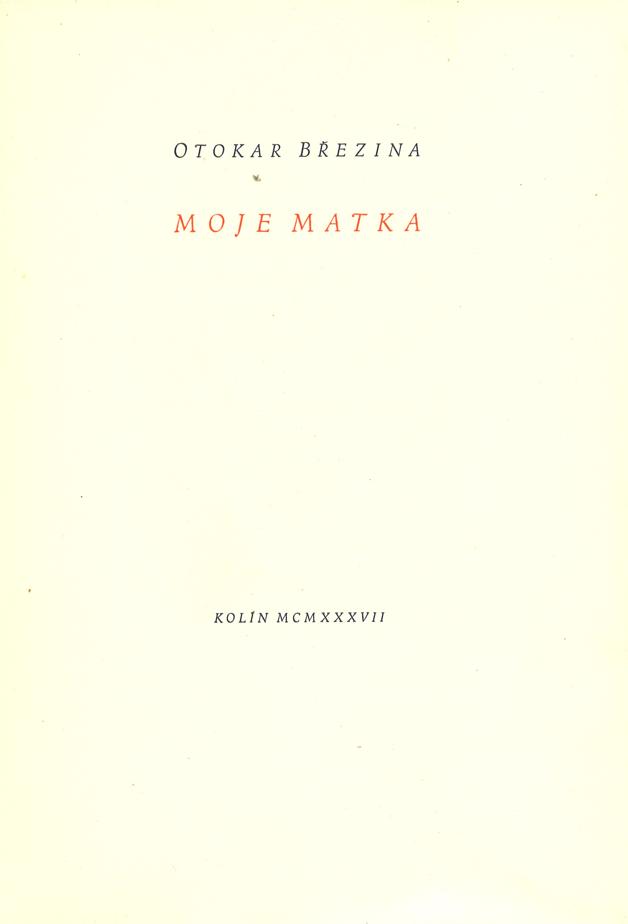 Title information Moje matka : báseň ze sbírky "Tajemné dálky" / Otokar Březina ; se suchou jehlou proti titulu a s kresbou na obálce od Bohuslava Kutila Personal name Březina, Otokar, 1868-1929 (Author) Další autoři Kutil, Bohuslav, 1907-1982 (Illustrator) (Inscriber) Hála, Rudolf, 1892-1968 (Book designer) Zach, František Josef (Publisher) Corporation Orbis (tiskárna) (Printer) Jan Štenc (nakladatelství, tiskárna) (Printer) Publication Kolín : Josef Zach, 1937 Manufacture V Praze : Orbis Scope 3 nečíslované listy ; 28,5 cm ISBN (Brožováno) Country Czech Republic Language Czech Note Zdobená obálka. - Frontispis s podpisem Bohuslava Kutila. - Dvoubarevný text. - Vytištěno písmem Menhartovým na ručním holandském papíře ve 125 výtiscích. - Bibliofilie.