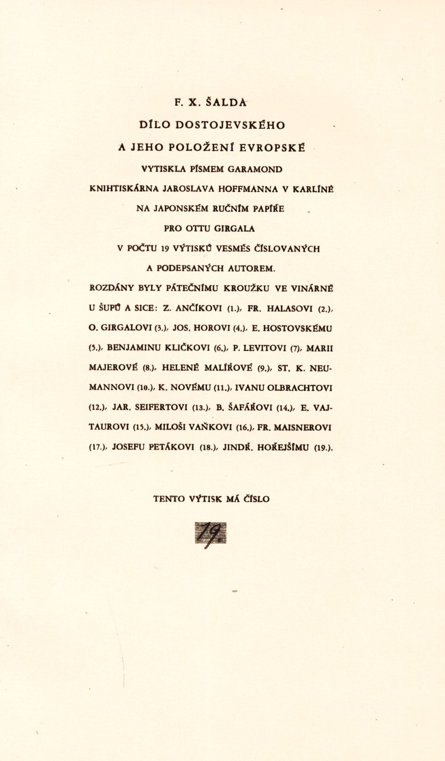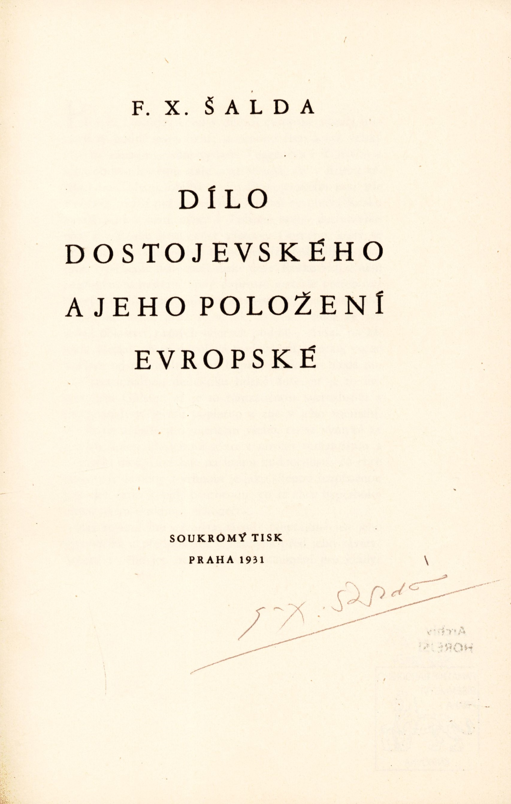 Title information Dílo Dostojevského a jeho položení evropské / F. X. Šalda Personal name Šalda, F. X., 1867-1937 (Author) Další autoři Knihtiskárna Jar. Hoffmanna (Printer) Publication [místo vydání neznámé] [nakladatel není znám], 1931 Manufacture V Karlíně : Knihtiskárna Jar. Hoffmanna, Scope 17 stran ; 23 cm ISBN (vázáno) Country Czech Republic Language Czech Note Původní kartonová vazba s přebalem s modrým štítkem s názvem a autorem. - Černobílý titulní list. - Tiráž.