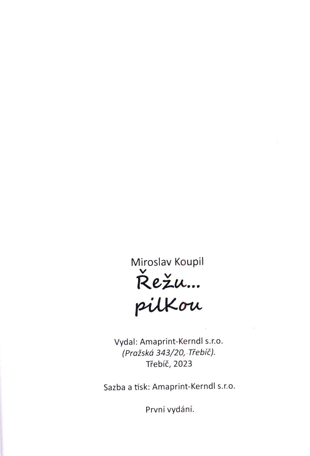 Title information Řežu pilkou / Miroslav Koupil Personal name Koupil, Miroslav, 1956- (Author) (Bookjacket designer) Další autoři Amaprint (nakladatelství, tiskárna) (Publisher) (Printer) Edition statement První vydání Publication Třebíč : Amaprint-Kerndl s.r.o., 2023 Manufacture Sazba a tisk Amaprint-Kerndl s.r.o. Scope 35 stran ; 15 cm ISBN 978-80-87710-62-3 (brožováno) Country Czech Republic Language Czech Note Obálka s barevným stylizovaným písmem. - Na zadním přídeští medailonek autora s fotoportrétem