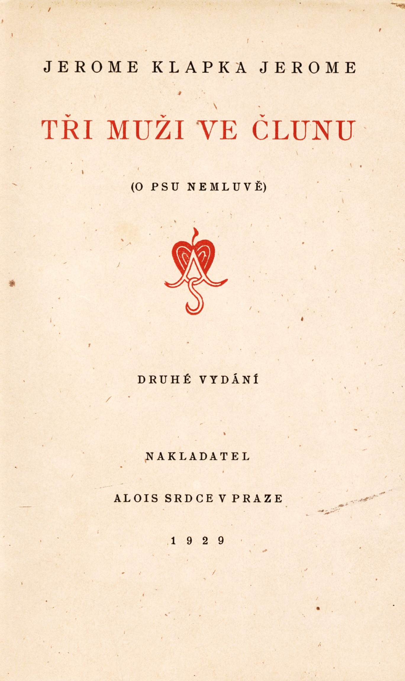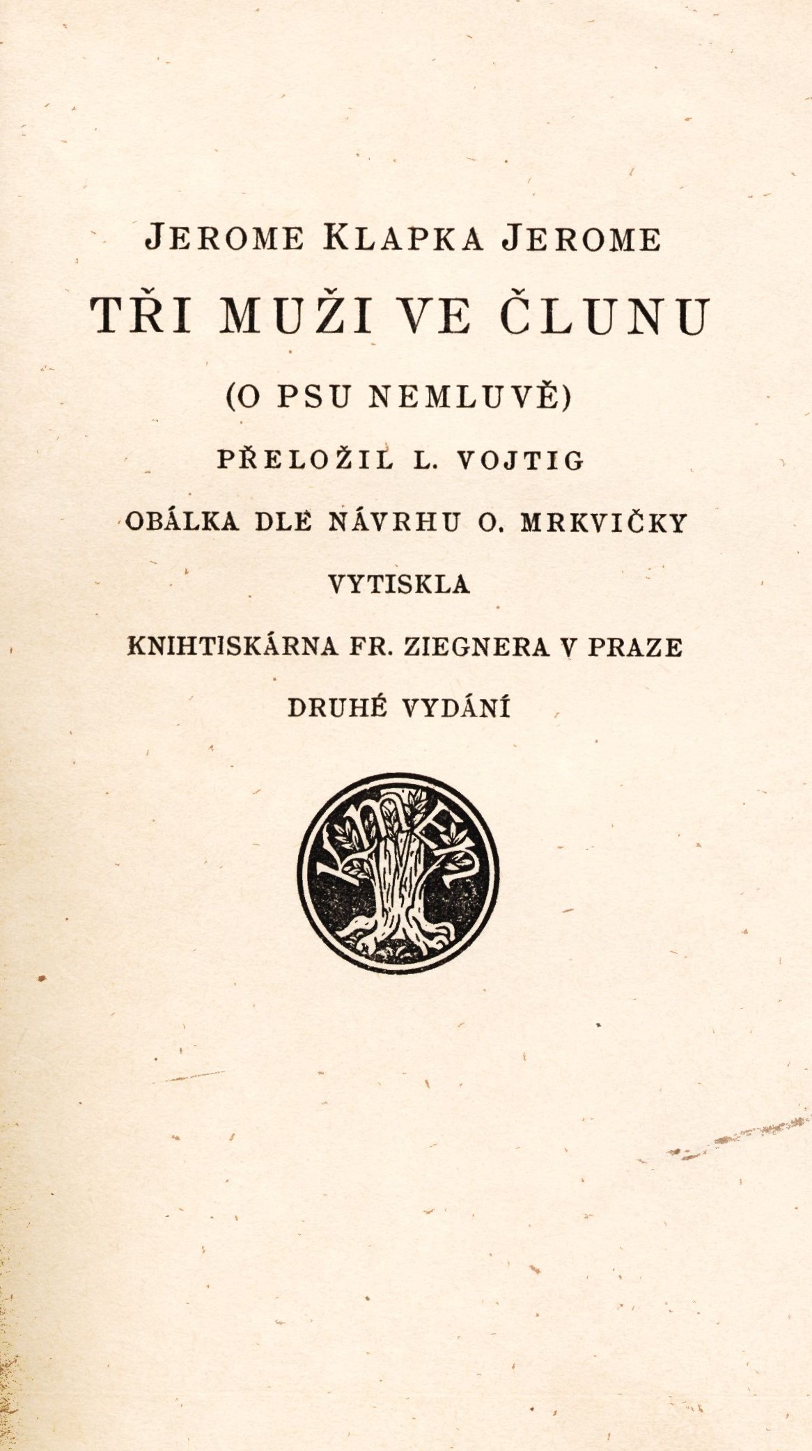 Title information Tři muži ve člunu (o psu nemluvě) / Jerome Klapka Jerome ; přeložil L. Vojtig Personal name Jerome, Jerome K. (Jerome Klapka), 1859-1927 (Author) Další autoři Vojtig, Ladislav, 1888-1952 (Translator) Mrkvička, Otakar, 1898-1957 (Bookjacket designer) Corporation Alois Srdce (nakladatelství) (Publisher) František Ziegner (Praha) (Printer) Edition statement Druhé vydání Publication V Praze : Alois Srdce, 1929 Manufacture V Praze : Fr. Ziegner Scope 190 stran ; 20 cm ISBN (brožováno) Country Czech Republic Language Czech Language of the original English Note Barevná, ilustrovaná obálka. - Na záložkách nakladatelská inzerce. - Dvoubarevný titulní list s nakladatelskou značkou. - Tiráž se značkou "Kmen".