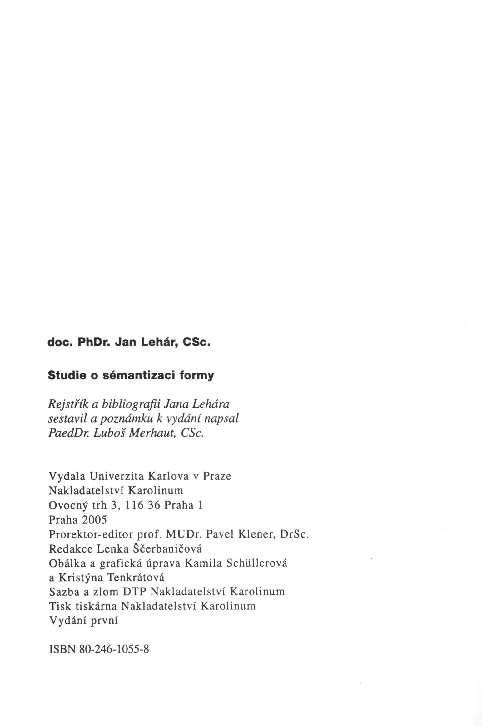 Title information Studie o sémantizaci formy / Jan Lehár ; rejstřík a bibliografii sestavil a poznámku k vydání napsal Luboš Merhaut Personal name Lehár, Jan, 1949-2004 (Author) Další autoři Merhaut, Luboš, 1961- (Editor) Corporation Karolinum (nakladatelství, tiskárna) (Publisher) (Printer) Edition statement Vydání první Publication V Praze : Nakladatelství Karolinum, 2005 Manufacture Tiskárna Nakladatelství Karolinum Scope 164 stran ; 21 cm ISBN 80-246-1055-8 (brožováno) Country Czech Republic Language Czech Note Typografická obálka. - Nakladatelská značka. - Předmluva. - Bibliografie autora. - Poznámky pod čarou. - Poznámka k vydání
