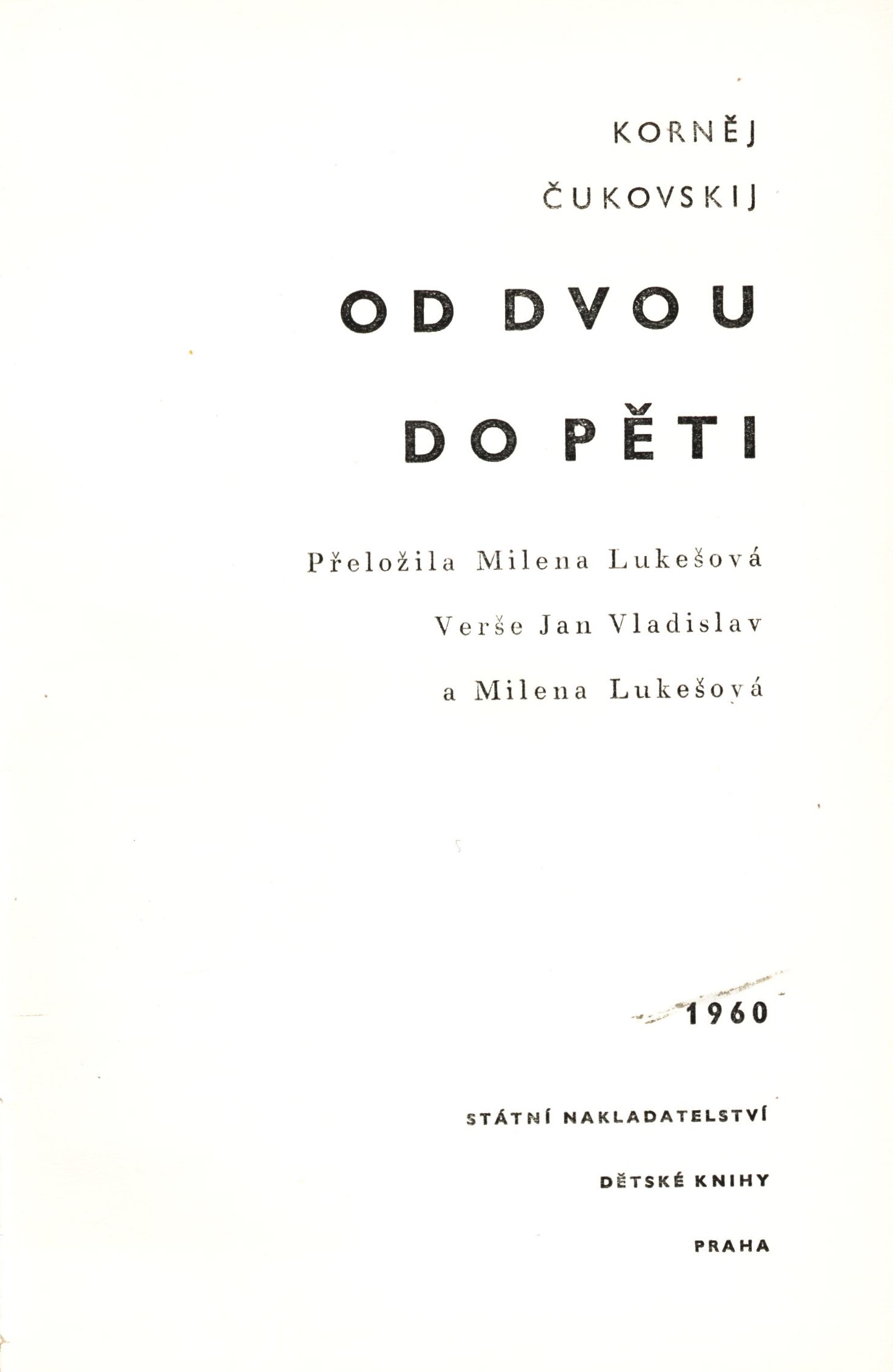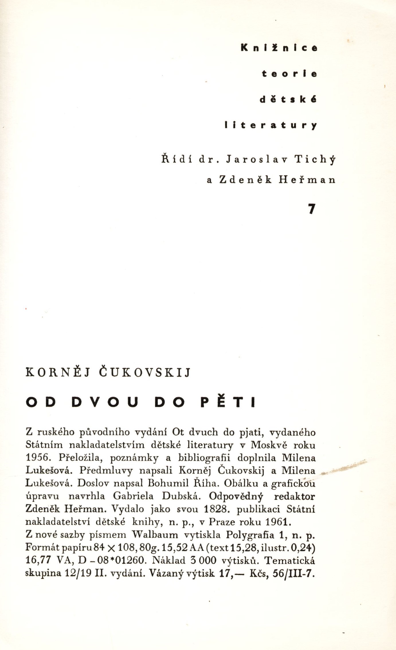 Title information Od dvou do pěti / Korněj Čukovskij ; přeložila Milena Lukešová ; doslov Bohumil Říha Personal name Čukovskij, Kornej Ivanovič, 1882-1969 (Author) (Author of introduction) Další autoři Lukešová, Milena, 1922-2008 (Translator) (Author of introduction) (Commentator) Vladislav, Jan, 1923-2009 (Translator) Říha, Bohumil, 1907-1987 (Author of afterword, colophon, etc.) Dubská, Gabriela, 1915-2003 (Bookjacket designer) (Book designer) Corporation Státní nakladatelství dětské knihy (Publisher) Polygrafia (firma) (Printer) Edition statement II. vydání Publication V Praze : Státní nakladatelství dětské knihy, 1961 Manufacture Polygrafia 1, n. p. Scope 371 stran ; 21 cm ISBN (vázáno) Edition Teorie dětské literatury (Státní nakladatelství dětské knihy)