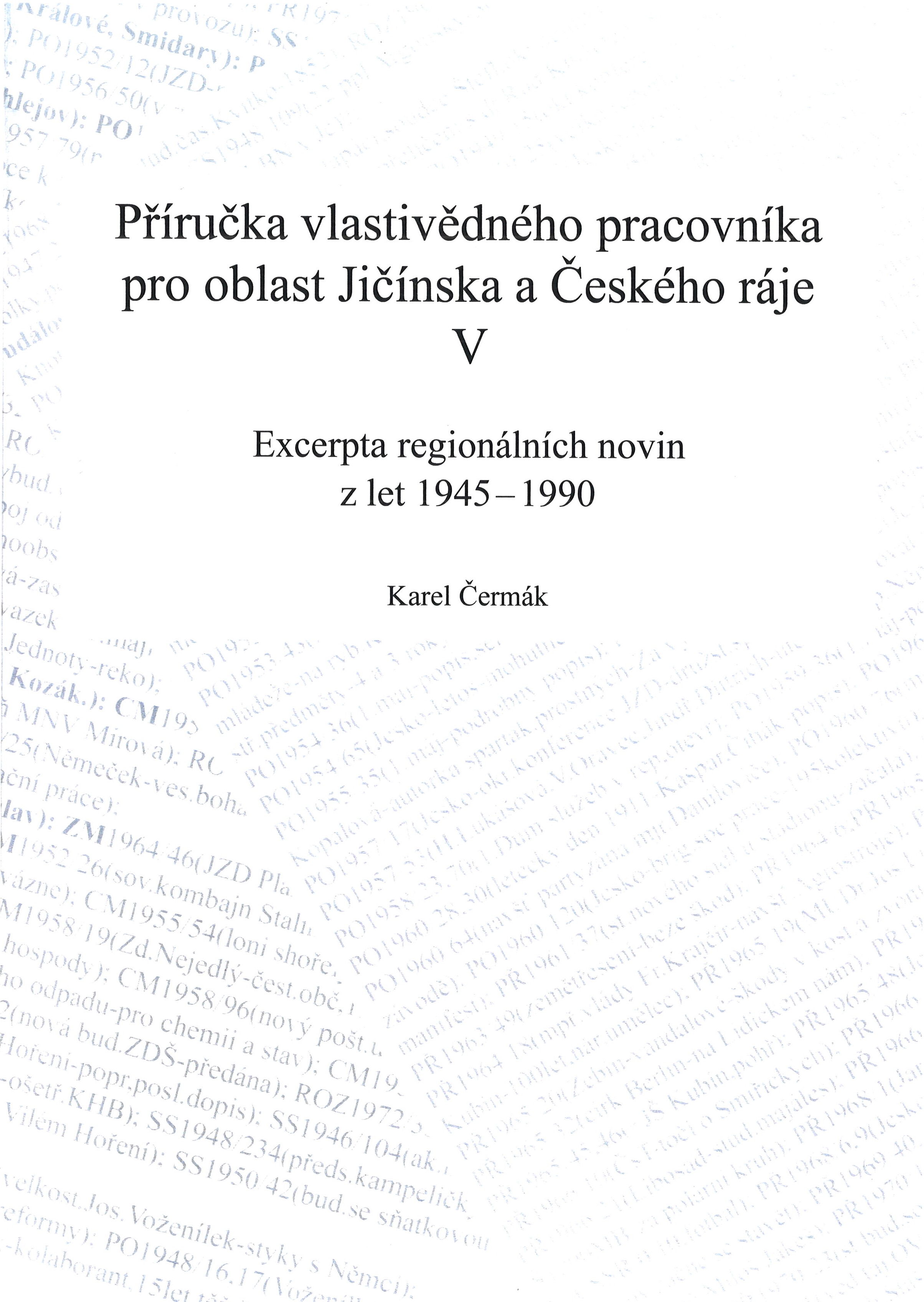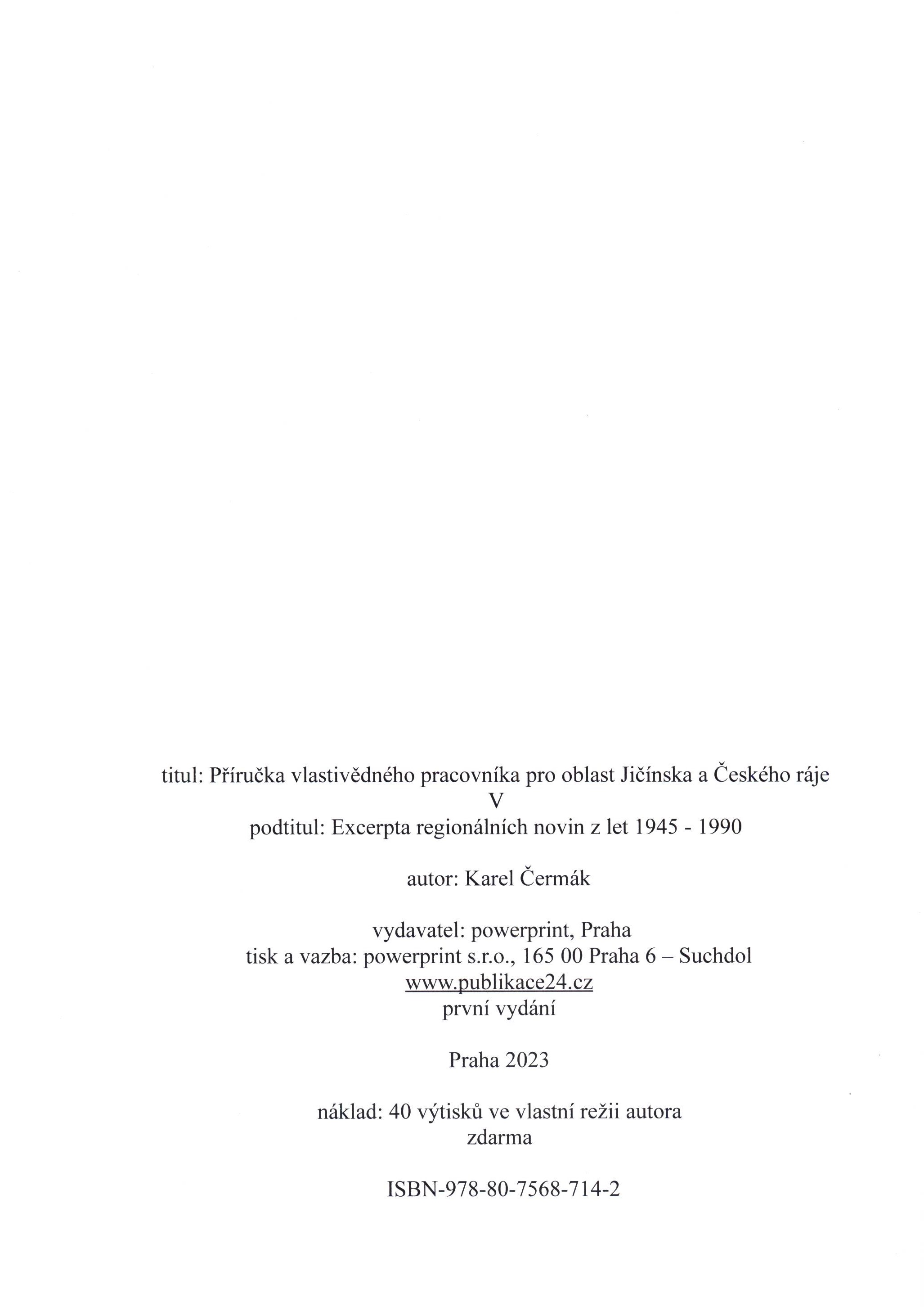 Title information Příručka vlastivědného pracovníka pro oblast Jičínska a Českého ráje. V, Excerpta regionálních novin z let 1945-1990 / Karel Čermák Personal name Čermák, Karel, 1954- (Author) Další autoři Powerprint (firma) (Publisher) Powerprint (tiskárna) (Printer) Edition statement První vydání Publication Praha : powerprint, 2022 Manufacture powerprint s. r. o. Scope 288 stran ; 30 cm ISBN 978-80-7568-714-2 (brožováno) Country Czech Republic Language Czech Note Zdobená obálka. - Seznam excerpovaných regionálních novin a jim přiřazených zkratek. - Seznam použitých zkratek. - Rejstřík měst a obcí. - Náklad: 40 výtisků ve vlastní režii autora zdarma