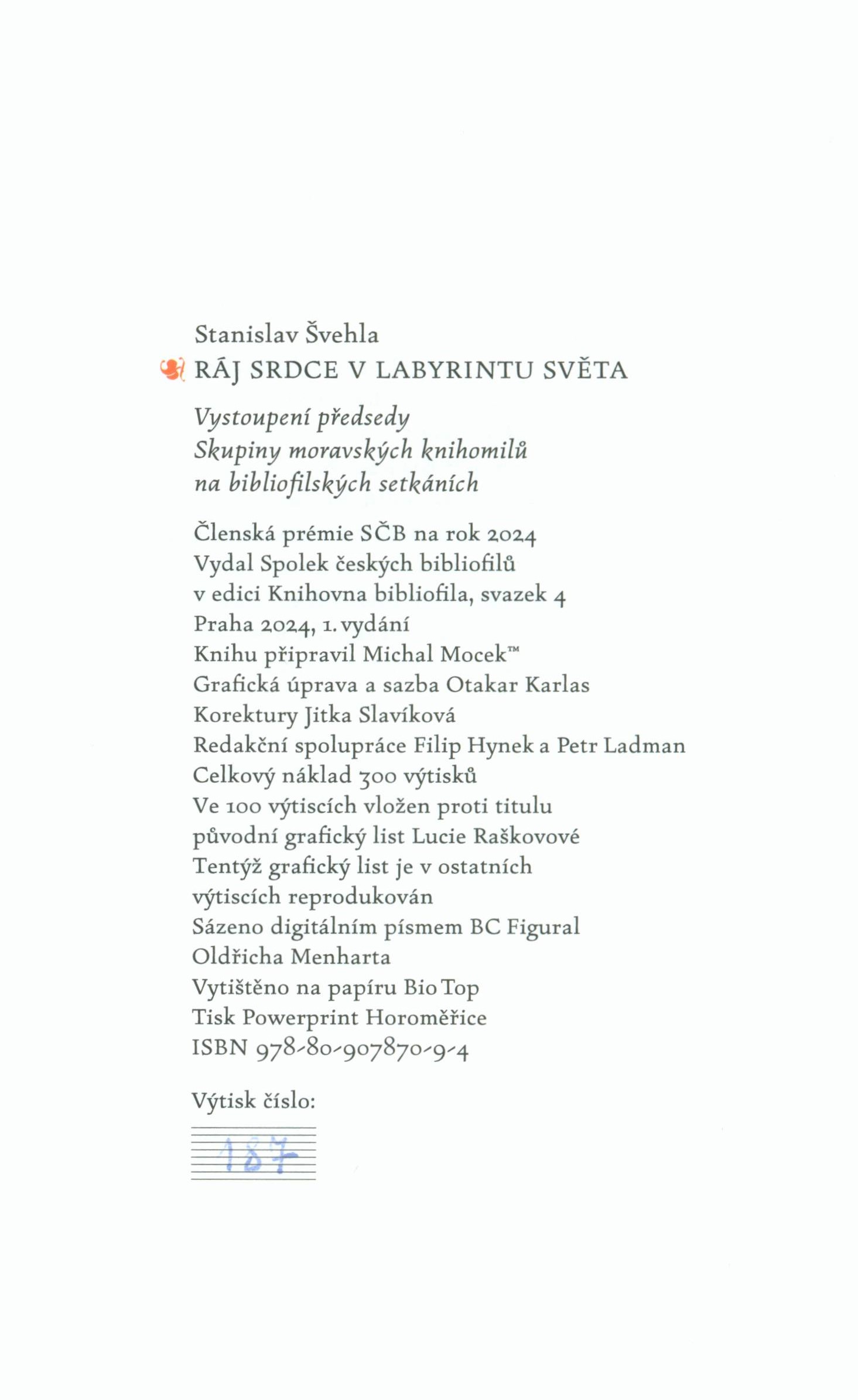 Knihovna bibliofila (Spolek českých bibliofilů)Country Czech Republic Language Czech Note Barevná obálka s černým textem. - Patitul. - Frontispis (barevný reprodukovaný grafický list). - Obsah. - Poděkování. - Úvodní slovo P. Ladman. - Úvodní text "Stanisla Švehla bibliofil". - Projevy. - Články, vystoupení, dopisy určené SČB (1930-1940). - Ediční činnost SČB. - Bibliofilské tisky (podíl S. Švehly). - Ediční poznámky. - Přebal.