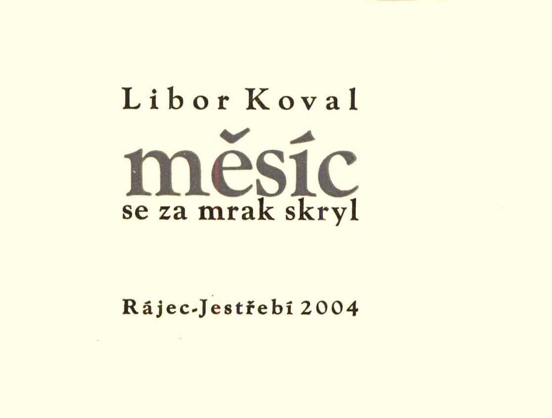 Title information Měsíc se za mrak skryl / Libor Koval Personal name Koval, Libor, 1930-2003 (Author) Další autoři Juránek, Jan (Publisher) (Printer) Publication Rájec-Jestřebí : [soukromý tisk Jan Juránek], 13 cm Scope 13 stran ; 8x11 cm ISBN (Bez vazby, volné dvojlisty v obálce) Country Czech Republic Language Czech Note Soukromý tisk. - V upomínku na Libora Kovala ... na ručním lisu 35 výtisků garmondem Venezianou vytiskl Jan Juránek. - Bez vazby, volné dvojlisty vložené v obálce s chlopní (formát na šířku). - Bibliofilie. - Rozměr 7,8 x 10,8 cm