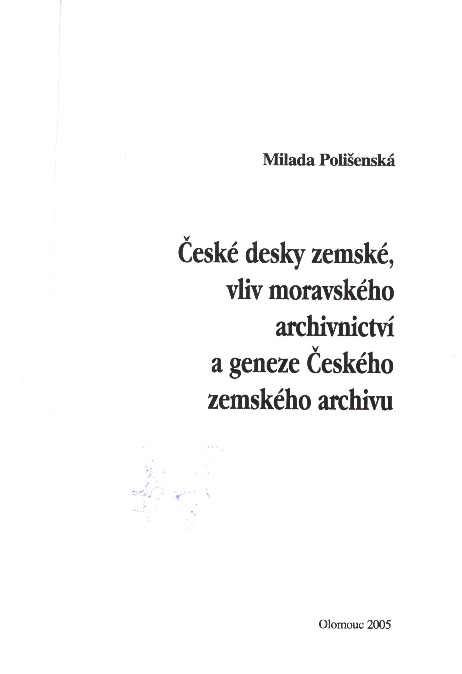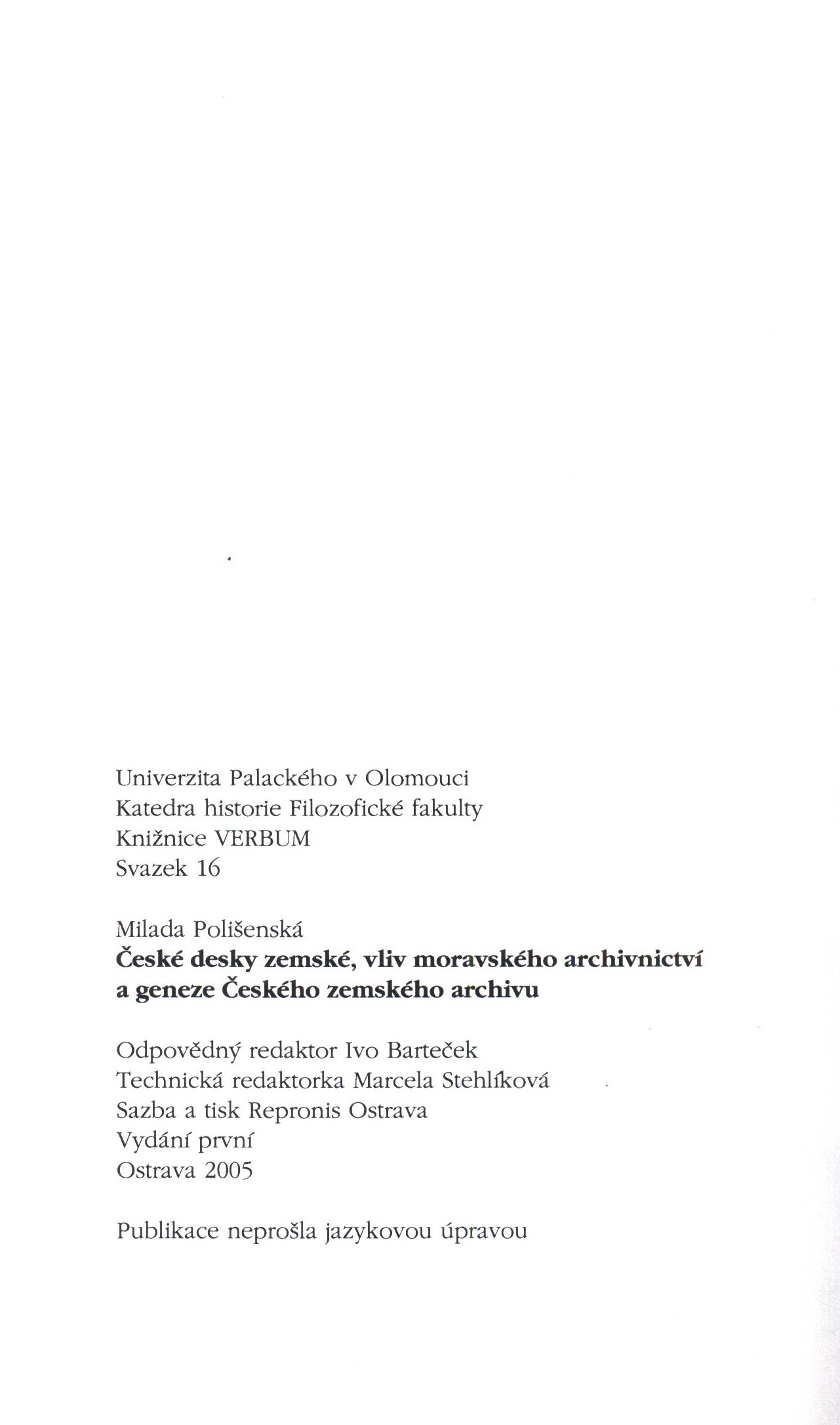 Title information České desky zemské, vliv moravského archivnictví a geneze Českého zemského archivu / Milada Polišenská Personal name Polišenská, Milada, 1952- (Author) Další autoři Univerzita Palackého. Katedra historie (Publisher) Repronis (Ostrava) (Printer) Edition statement Vydání první Publication Olomouc : Univerzita Palackého v Olomouci, Katedra historie Filozofické fakulty, 2005 Manufacture Ostrava : Repronis Scope 196 stran ; 21 cm ISBN 80-244-1319-1 (v knize neuvedeno ; brožováno) Edition Verbum, (Univerzita Palackého v Olomouci) ; svazek 16