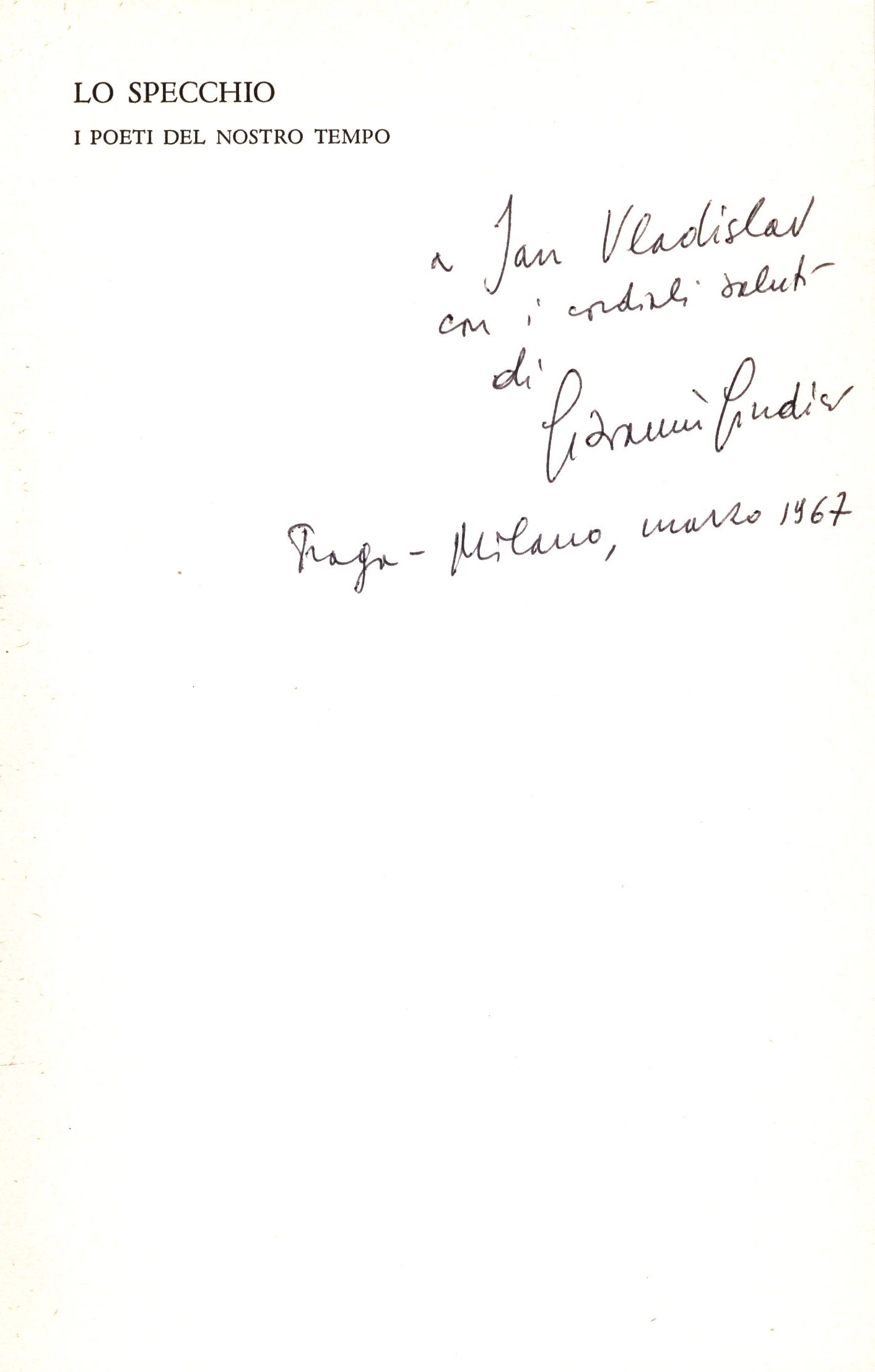 Title information La vita in versi / Giovanni Giudici Personal name Giudici, Giovanni, (Author) (Dedicator) 1924-2011 Další autoři Vladislav, Jan, 1923-2009 (Dedicatee) Corporation Arnoldo Mondadori editore (Publisher) Publication [Milano] : Arnoldo Mondadori editore, 1965 Manufacture Verona : Officine grafiche di Verona Scope 183 stran ; 19 cm ISBN (vázáno) Edition Lo Specchio. I Poeti del nostro tempo