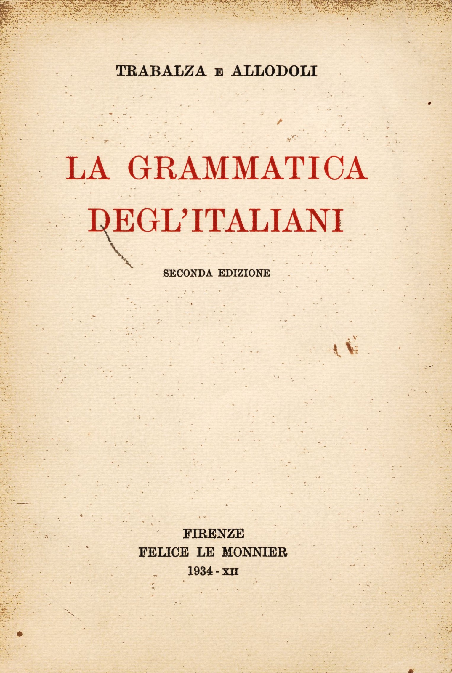 Title information La grammatica degl'italiani / Trabanza e Allodoli Personal name Trabalza, Ciro, 1871-1936 (Author) Další autoři Allodoli, Ettore, 1882-1960 (Author) Corporation Felice Le Monnier (firma) (Publisher) Edition statement Seconda edizione Publication Firenze : Felice le Monnier, 1934 Manufacture Tipografia E. Ariani Scope 341 stran ; 20 cm ISBN (vázáno) Country Italy Language Italian Note Dvoubarevná obálka. - Černobílý titulní list. - Obsah.