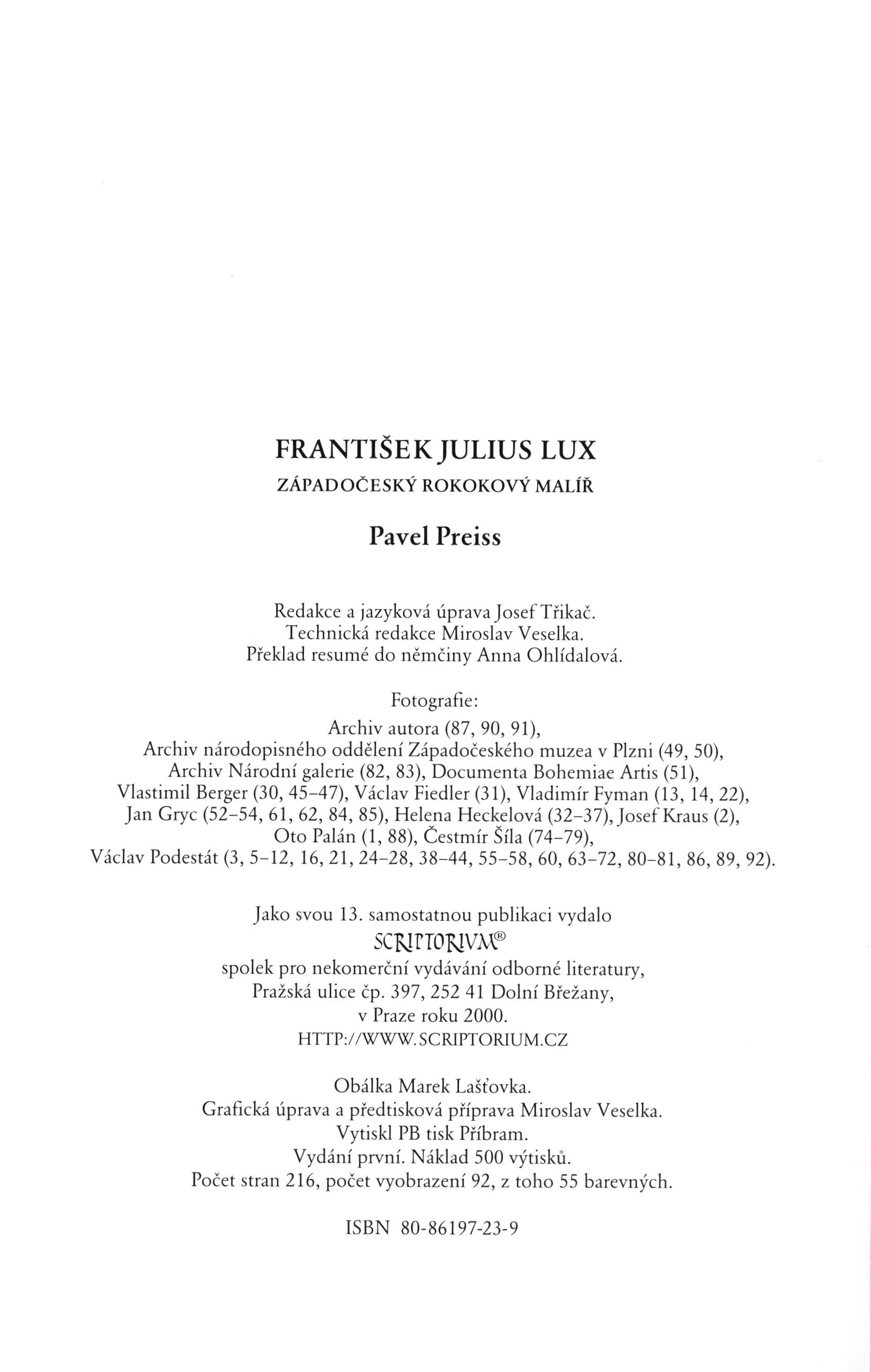 1. Title informationFrantišek Julius Lux : západočeský rokokový malíř / Pavel Preiss