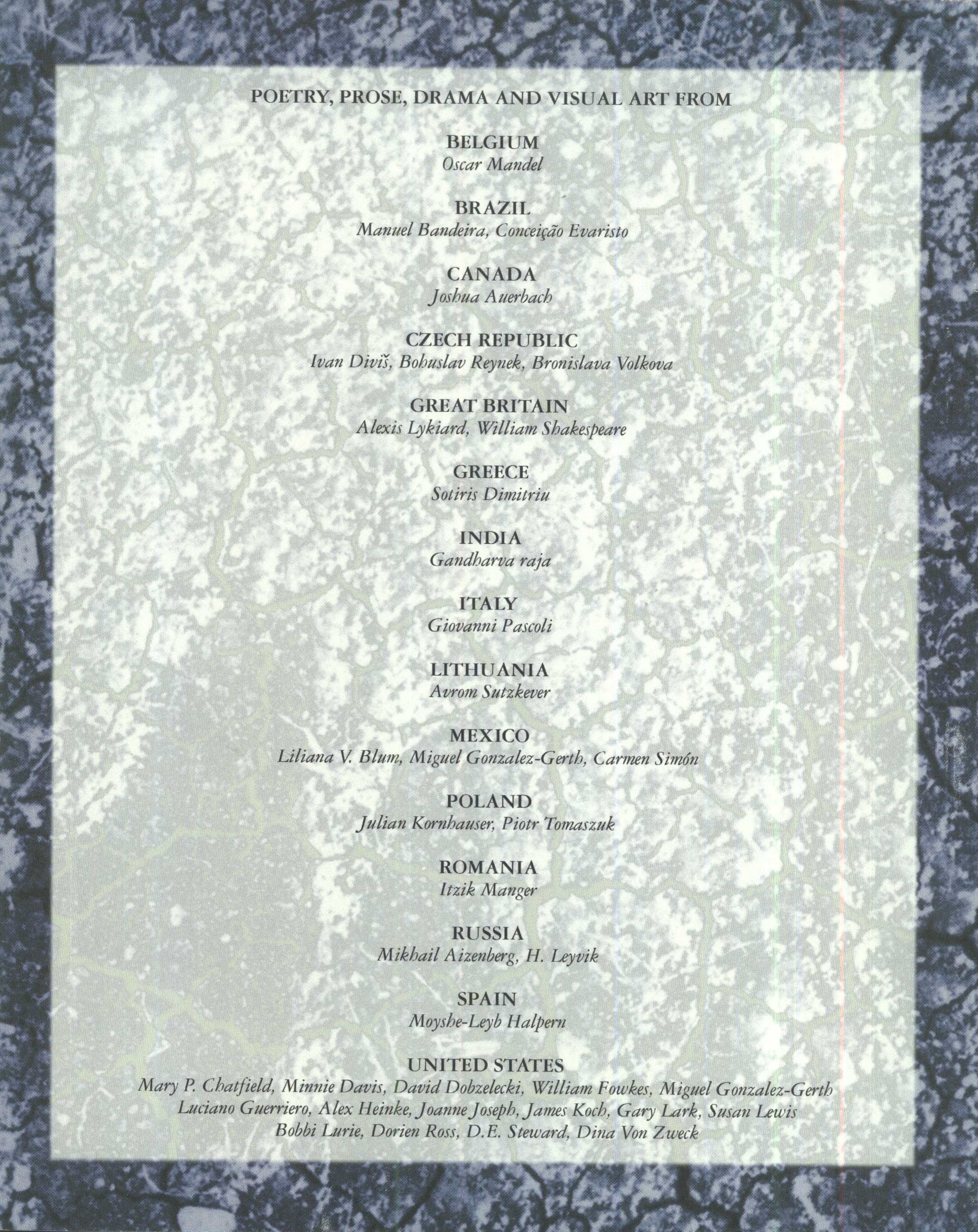 Title information The Dirty Goat. 15 / edited by Elzbieta Szoka and Joe W. Bratcher III Personal name Szoka, Elzbieta (Editor) Další autoři Bratcher, Joe W. III (Editor) Publication Austin : Host Publications, [2006] Copyright notice date ©2006 Scope 205 stran : fotografie, ilustrace ; 25,5 cm ISBN (Brožováno) ISSN 1042-4768 Country United States Language English Language of the original Multiple languages Note Zdob. obálka. - Barevné fotografie a ilustrace. - Některé texty též v jazyce originálu