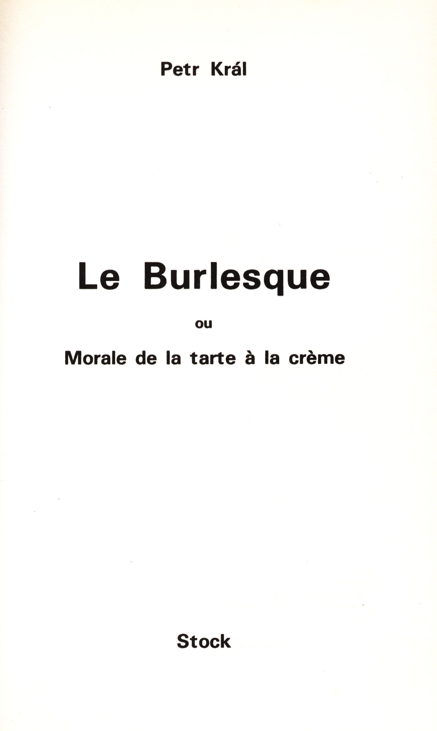 Title information Le Burlesque ou Morale de la tarte à la crème / Petr Král Personal name Král, Petr, 1941-2020 (Author) (Dedicator) Další autoři Vladislav, Jan, 1923-2009 (Dedicatee) Corporation Stock (firma) (Publisher) Société Nouvelle Firmin Didot (tiskárna) (Printer) Publication Paris : Stock, 1984 Manufacture Mesnil-sur-l´Estrée : Société Nouvelle Firmin Didot Scope 342 stran, 16 stran nečíslované obrazové přílohy : černobílé fotografie ; 23 cm ISBN 2-234-01178-5 (brožováno) Edition Cinema