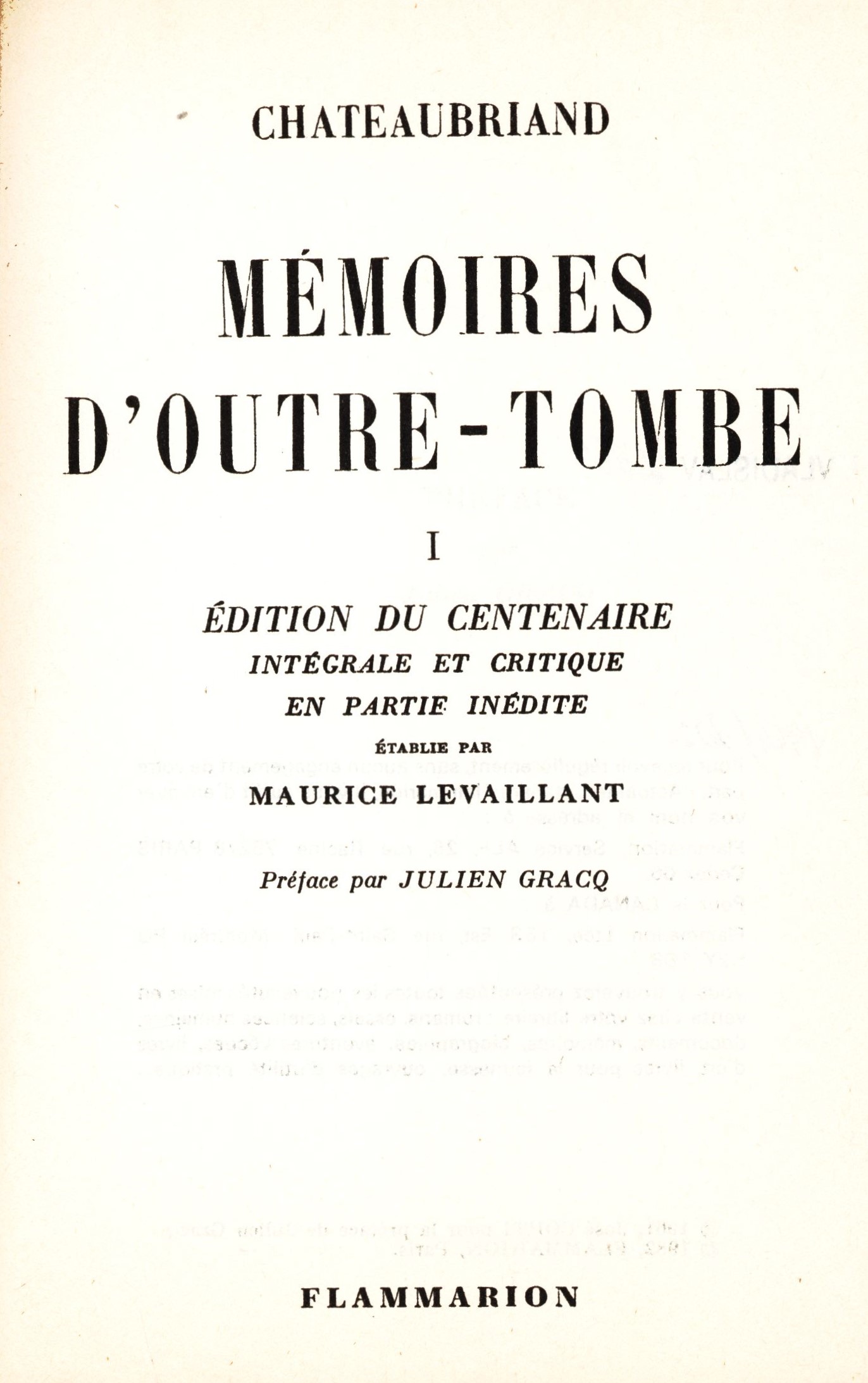 Title information Mémoires d'outre-tombe. I : édition du centenaire intégrale et critique en partie inédite / Chateaubriand ; établie par Mauric Levaillant ; Préface par Julien Gracq Personal name Chateaubriand, François-René de, 1768-1848 (Author) Další autoři Levaillant, Maurice, 1884-1961 (Editor) Gracq, Julien, 1910-2007 (Author of introduction) Corporation Flammarion (nakladatelství) (Publisher) Oberthur (firma) (Printer) Publication Paris : Flammarion, 1982 Manufacture Rennes : Oberthur Scope 657 stran ; 19 cm ISBN (brožováno) Country France Language French Note Barevná zdobená obálka. - Černobílý titulní list. - Poznámky pod čarou. - Obsah.