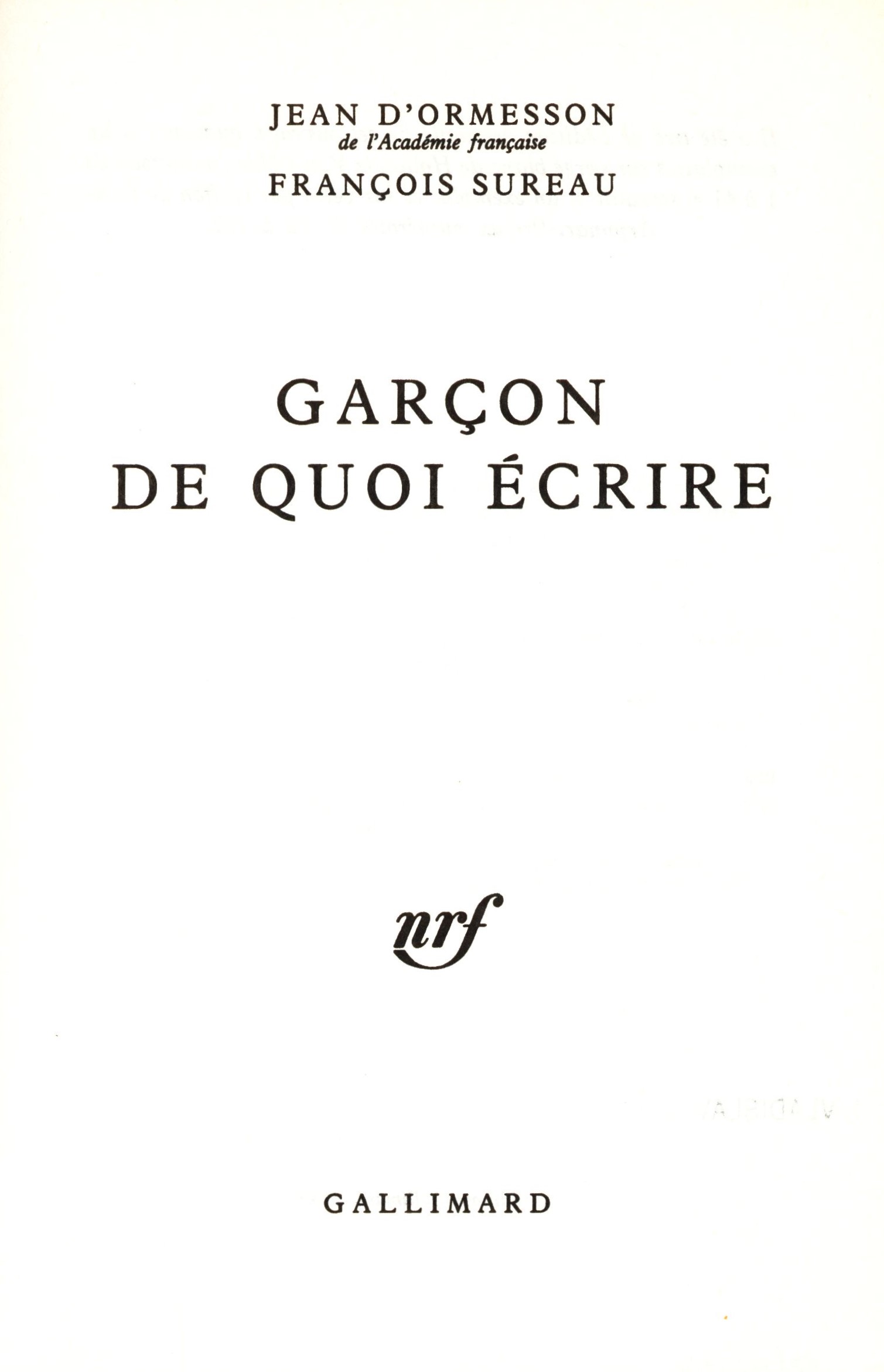 Názvové údaje Garçon de quoi écrire / Jean d'Ormesson ; François Sureau Osobní jméno Ormesson, Jean d', 1925-2017 (Autor) Další autoři Sureau, François, 1957- (Autor) Korp. Gallimard (firma) (Nakladatel, vydavatel) Société Nouvelle Firmin Didot (tiskárna) (Tiskař) Nakladatel Paris : Gallimard, 1989 Výrobce Mesnil-sur-l'Estrée : Société Nouvelle Firmin Didot Rozsah 276 stran ; 21 cm ISBN 2-07-071762-3 (brožováno) Země vyd. Francie Jazyk dok. francouzština Poznámky Dvoubarevná obálka. - Černobílý titulní list s nakladatelským signetem. - Obsah.