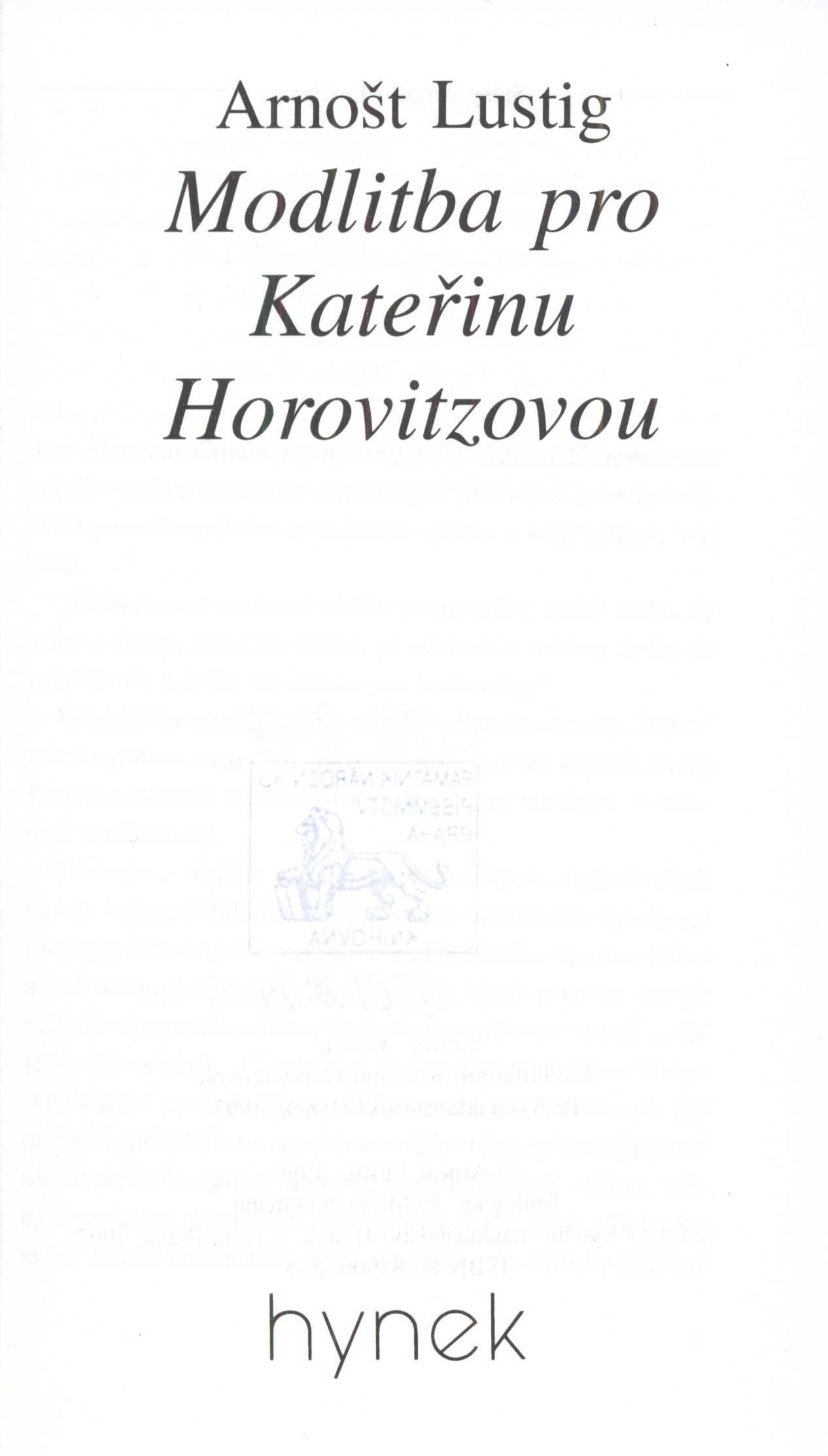 Title information Modlitba pro Kateřinu Horovitzovou / Arnošt Lustig ; typografie a sazba Cadis Praha Personal name Lustig, Arnošt, 1926-2011 (Author) Další autoři Jungmann, Milan, 1922-2012 (Author of afterword, colophon, etc.) Corporation Cadis (DTP studio) (Typographer) (Compositor) Hynek (nakladatelství) (Publisher) BBS tiskárna Vimperk, s.r.o. (Printer) Edition statement Vydání čtvrté Publication Praha : Hynek, 1997 Manufacture Vimperk : BBS Scope 145 stran ; 21 cm ISBN 80-85906-46-5 (vázáno) Edition Spisy Arnošta Lustiga ; svazek 3