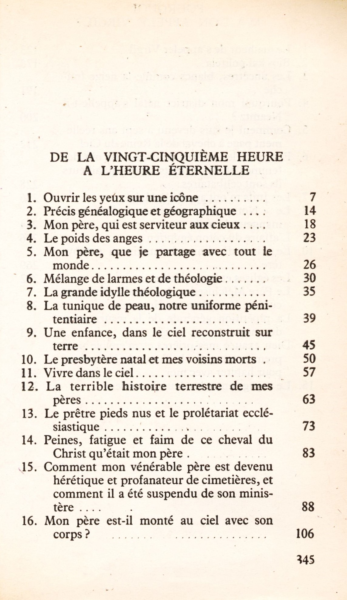 Title information De la Vingt-Cinquième Heure à l'heure éternelle : Suivi de Pourquoi m'a-t-on appele Virgil ? Virgil Gheorghiu Personal name Gheorghiu, Virgil, 1916-1992 (Author) Další autoři Plon (firma) (Publisher) Bussière (firma) (Printer) Publication [Paris] : Librairie Plon, 1977 Manufacture Saint Amand : Bussière Scope 341 stran ; 18 cm ISBN 2-266-00262-7 (brožováno) Edition Presses pocket : 1439