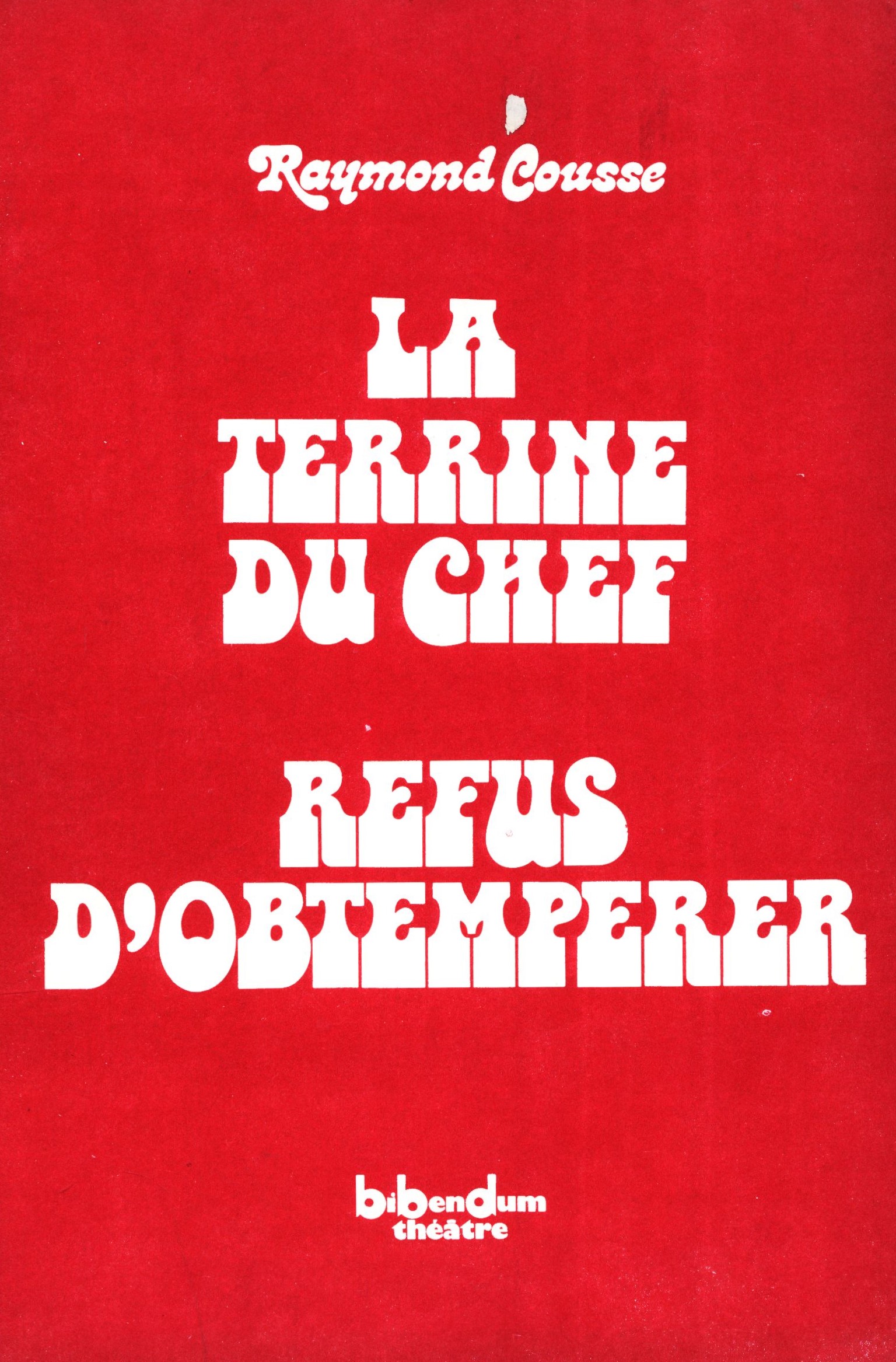 Title information La Terrine du Chef : Refus d'obtempérer / Raymond Cousse Personal name Cousse, Raymond, 1942-1991 (Author) Publication [místo vydání není známé] : Bibendum Théâtre, [1974] Scope 80 stran : fotografie ; 20 cm ISBN (brožováno) Country France Language French Note Růžová typografická obálka s bílým textem. - Typografický titulní list. - Celostránkové fotografie z představení.