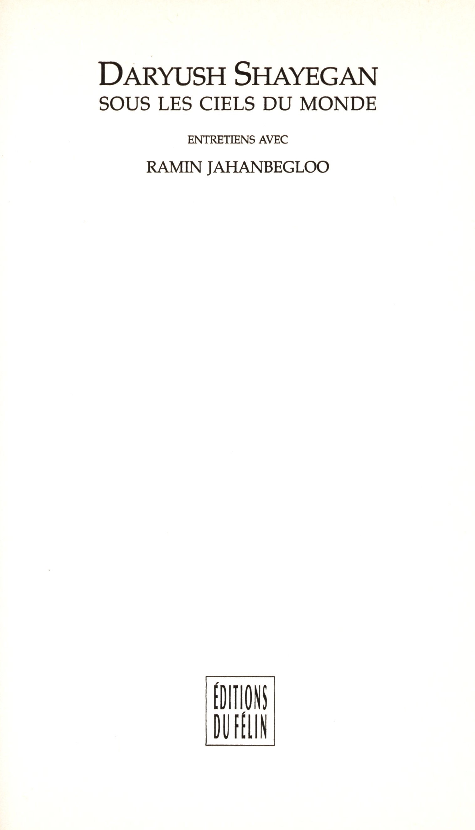 Title information Sous les ciels du monde : entretiens avec Ramin Jahanbegloo / Daryush Shayegan Personal name Shayegan, Daryush, 1935-2018 (Author) Další autoři Jahanbegloo, Ramin, 1956- (Interviewee) (Dedicator) Vladislav, Jan, 1923-2009 (Dedicatee) Corporation Editions du Félin (nakladatelství) (Publisher) Firmin-Didot (firma) (Printer) Publication Paris : Editions du Félin, 1992 Manufacture Mesnil sur l'Estrée : Société nouvelle Firmin-Didot Scope 297 stran ; 23 cm ISBN 2-86645-117-1 (brožováno) Edition Philosophie
