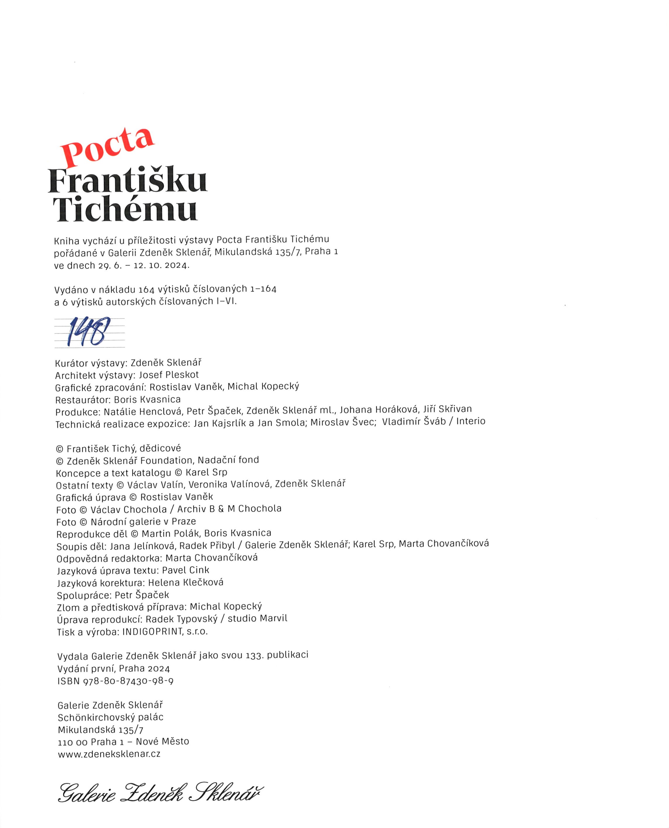 Zdobená vazba se zdobeným přebalem (fragmenty děl Fr. Tichého). - Černobílé fotoportréty autora a jeho přátel. - Seznam vystavených děl ze soukromé sbírky Václala Valína. - Kurátor výstavy Zdeněk Sklenář
