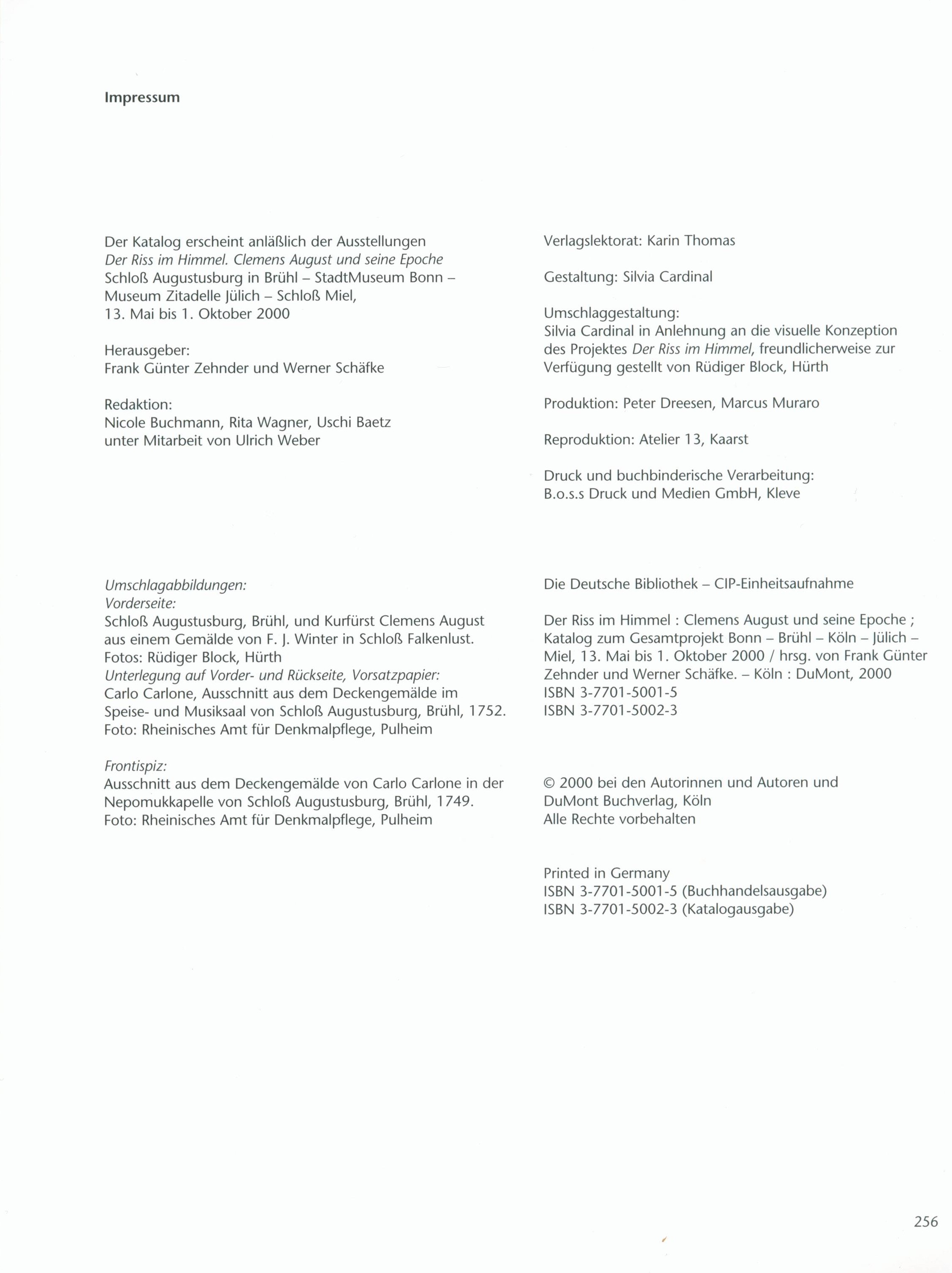 Title information Der Riss im Himmel : Clemens August und seine Epoche : Katalog zum Gesamtprojekt Bonn - Brühl - Köln - Jülich - Miel, 13. Mai bis 1. Oktober 2000 / herausgegeben von Frank Günter Zehnder, Werner Schäfke Další autoři Zehnder, Frank Günter, 1938- (Editor) Schäfke, Werner, 1944- (Editor) Corporation DuMont Buchverlag (Publisher) B.O.S.S Druck Und Medien GmbH (tiskárna) (Printer) Publication Köln : Dumont, 2000 Manufacture Kleve : B.o.s.s. Druck und Medien GmbH Scope 256 stran : ilustrace (převážně barevné), portréty, plány ; 27 cm ISBN 3-7701-5001-5 (Buchhandlungausgabe ; vázáno) 3-7701-5002-3 (Katalogausgabe ; vázáno) Country Germany Language German Note Vazba s barevnou koláží, dvoubarevný text (i na hřbetu). - Barevné ilustrované předsádky. - Patitul. - Frontispis. - Dvoubarevný text na titulním listu. - Loga sponzorů a partnerů na rubu titulního listu. - Organizace projektu. - Obsah. - Pozdravy. - Texty. - Barevné fotografie, portréty, reprodukce, faksimile s popisky. - Zkratky. - Seznam vyobrazení. - Stručná anotace, adresy výstavních míst na zadní straně vazby.