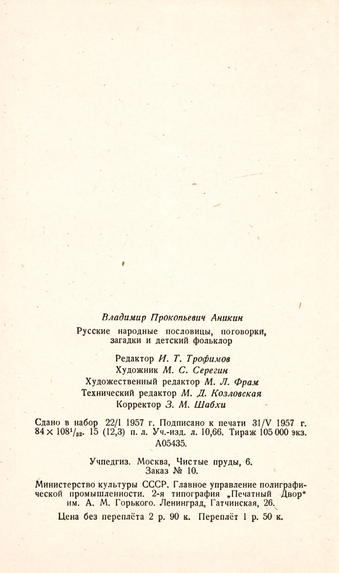 Russkije narodnyje poslovicy, pogovorki, zagadki i detskij fol'klor : posobije dlja učitelja / V.P. Anikin. -- Moskva : Gosudarstvennoje učebno-pedagogičeskoje izdatel'stvo Ministerstva prosveščenija RSFSR, 1957. -- Pečatnyj dvor. -- 239 stran ; 21 cm. -- Obálka s ražbou názvu a zlatými ornamenty. - Dvoubarevný titulní list. - Tiráž. - Nadpisy dekorovány. - Obsah. -- Obsahuje bibliografii. -- ISBN : (vázáno).