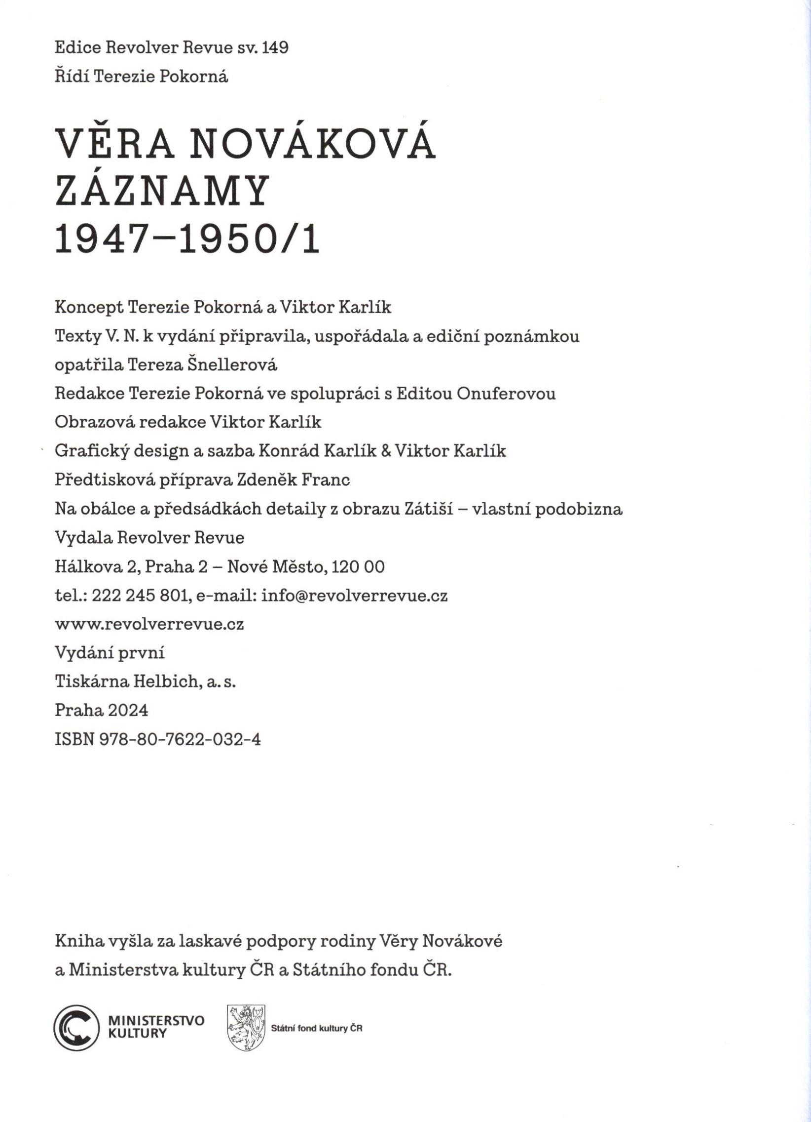 Title information Věra Nováková : záznamy 1947-1950/1 / texty V.N. k vydání připravila, uspořádala a ediční poznámkou opatřila Tereza Šnellerová Personal name Nováková, Věra, 1928-2024 (Author) Další autoři Šnellerová, Tereza, 1988- (Editor) Corporation Revolver Revue (nakladatelství) (Publisher) Tiskárna Helbich (Printer) Edition statement Vydání první Publication Praha : Revolver Revue, 2024 Manufacture Tiskárna Helbich, a.s. Scope 143 stran : ilustrace (převážně barevné), portréty, faksimile ; 21 cm ISBN 978-80-7622-032-4 (vázáno) : Edition Edice Revolver Revue ; sv. 149