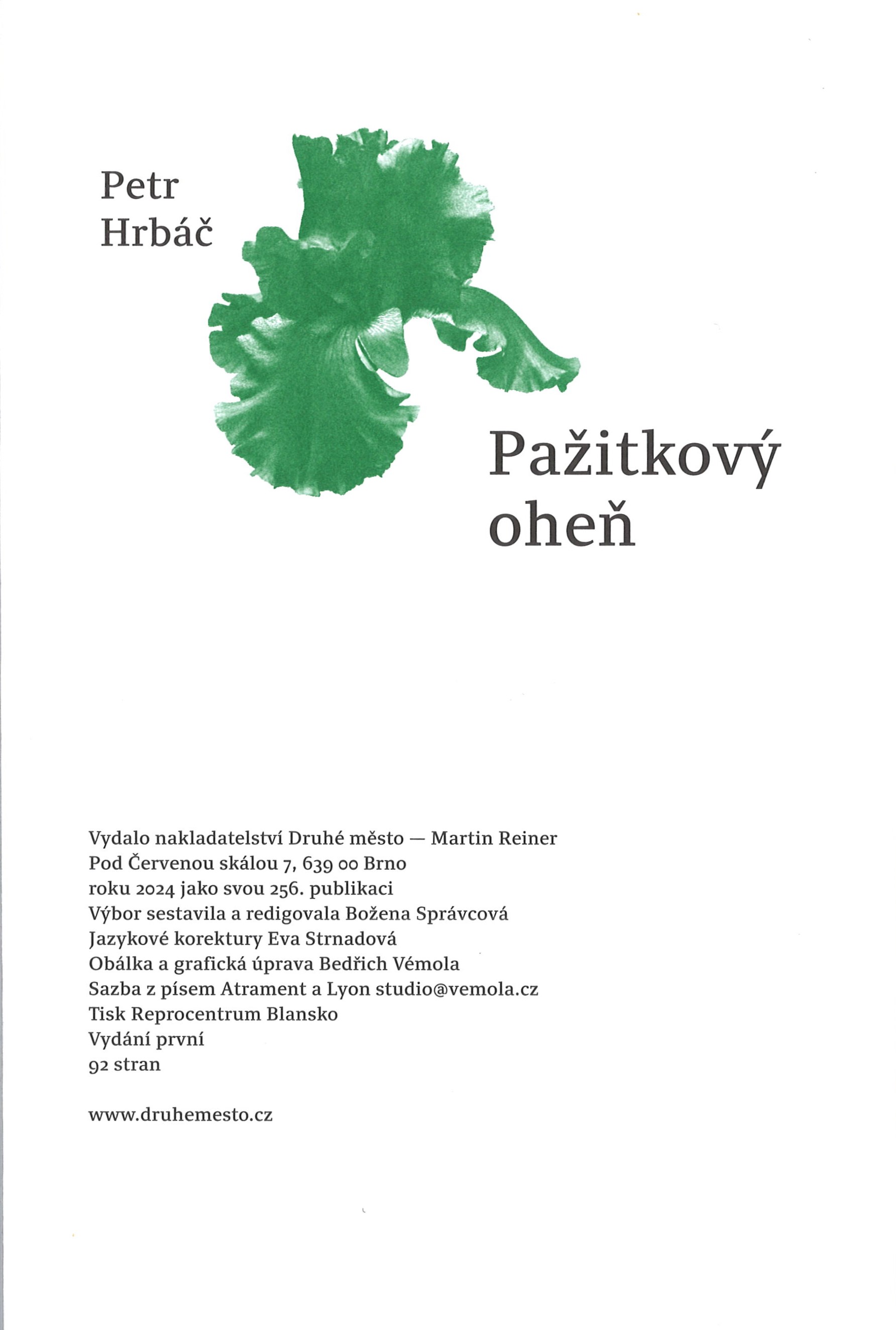 - Názvové údaje - Pažitkový oheň : výbor z básnického díla / Petr Hrbáč ; výbor sestavila a redigovala Božena Správcová ; obálka a grafická úprava Bedřich Vémola - Osobní jméno - Hrbáč, Petr, 1958-2020 (Autor) - Další autoři - Správcová, Božena, 1969- (Editor) - Vémola, Bedřich, 1970- (Autor obálky) (Knižní grafik) - Korp. - Druhé město (nakladatelství) (Nakladatel, vydavatel) - Tiskárna Reprocentrum (Tiskař) - Údaje o vydání - Vydání první - Nakladatel - Brno : Druhé město, 2024 - Výrobce - [Blansko] : Reprocentrum Blansko - Rozsah - 87 stran : ilustrace ; 23 cm - ISBN - 978-80-7227-910-4 (brožováno) - Země vyd. - Česko - Jazyk dok. - čeština - Poznámky - Zdobená obálka a záložky. - Ilustrovaný rozložený titulní list. - Před doslovem dvoustránková ilustrace. - Ilustrovaná tiráž. - Doslov Boženy Správcové "Cesty přesnosti" s biografickými informacemi o autorovi. - Ediční poznámka