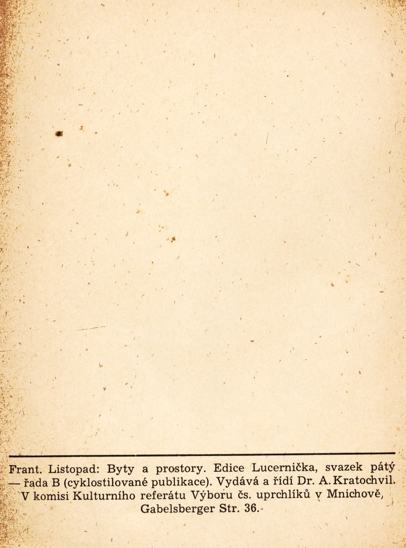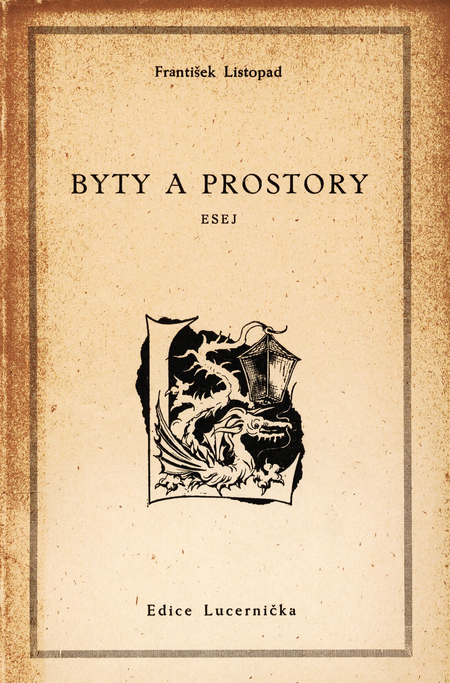Title information Byty a prostory : esej / František Listopad Personal name Listopad, František, 1921-2017 (Author) Publication Mnichov : Kulturní referát Výboru čs. uprchlíků, 1957 Scope 44 stran ; 20 cm ISBN (brožováno) Edition Lucernička ; svazek pátý řada B