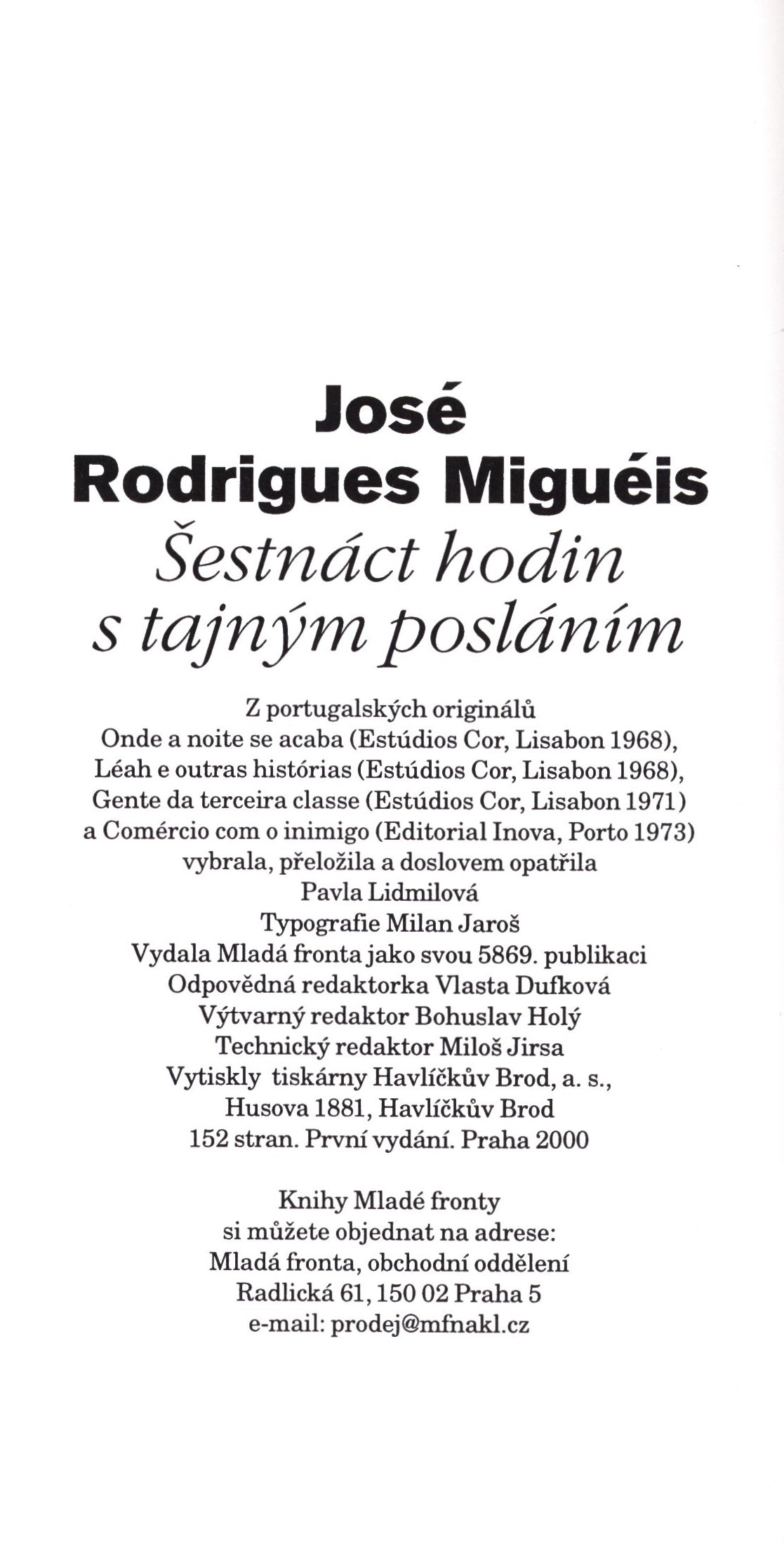 Title information Šestnáct hodin s tajným posláním / José Rodrigues Miguéis ; vybrala, přeložila a doslovem opatřila Pavla Lidmilová ; typografie Milan Jaroš Personal name Miguéis, José Rodrigues, 1901-1980 (Author) Další autoři Lidmilová, Pavla, 1932-2019 (Compiler) (Translator) (Author of afterword, colophon, etc.) (Dedicator) Jaroš, Milan, 1953- (Typographer) Listopad, František, 1921-2017 (Dedicatee) Corporation Mladá fronta (nakladatelství) (Publisher) Tiskárny Havlíčkův Brod (firma) (Printer) Edition statement První vydání Publication Praha : Mladá fronta, 2000 Manufacture Havlíčkův Brod : Tiskárny Havlíčkův Brod Scope 149 stran ; 19 cm ISBN 80-204-0782-0 (brožováno) Country Czech Republic Language Czech Language of the original Portuguese Note Typografická obálka. - Text na záložkách. - Titulní list. - Obsah. - Tiráž.