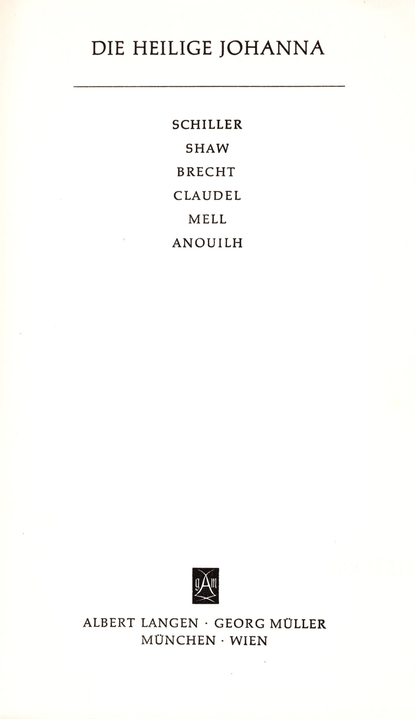Die heilige Johanna: Schiller, Shaw, Brecht, Claudel, Mell, Anouilh / Herausgegeben von Joachim Schondorff ; Mit einem Vorwort von Peter Demetz. -- München-Wien : Albert Langen-Georg Müller, 1964. -- 467 stran ; 21 cm. -- (Theater der Jahrhunderte). -- Typografická dvoubarevná obálka. - Titulní list s nakladatelským signetem. - Obsah. -- ISBN : (brožováno).