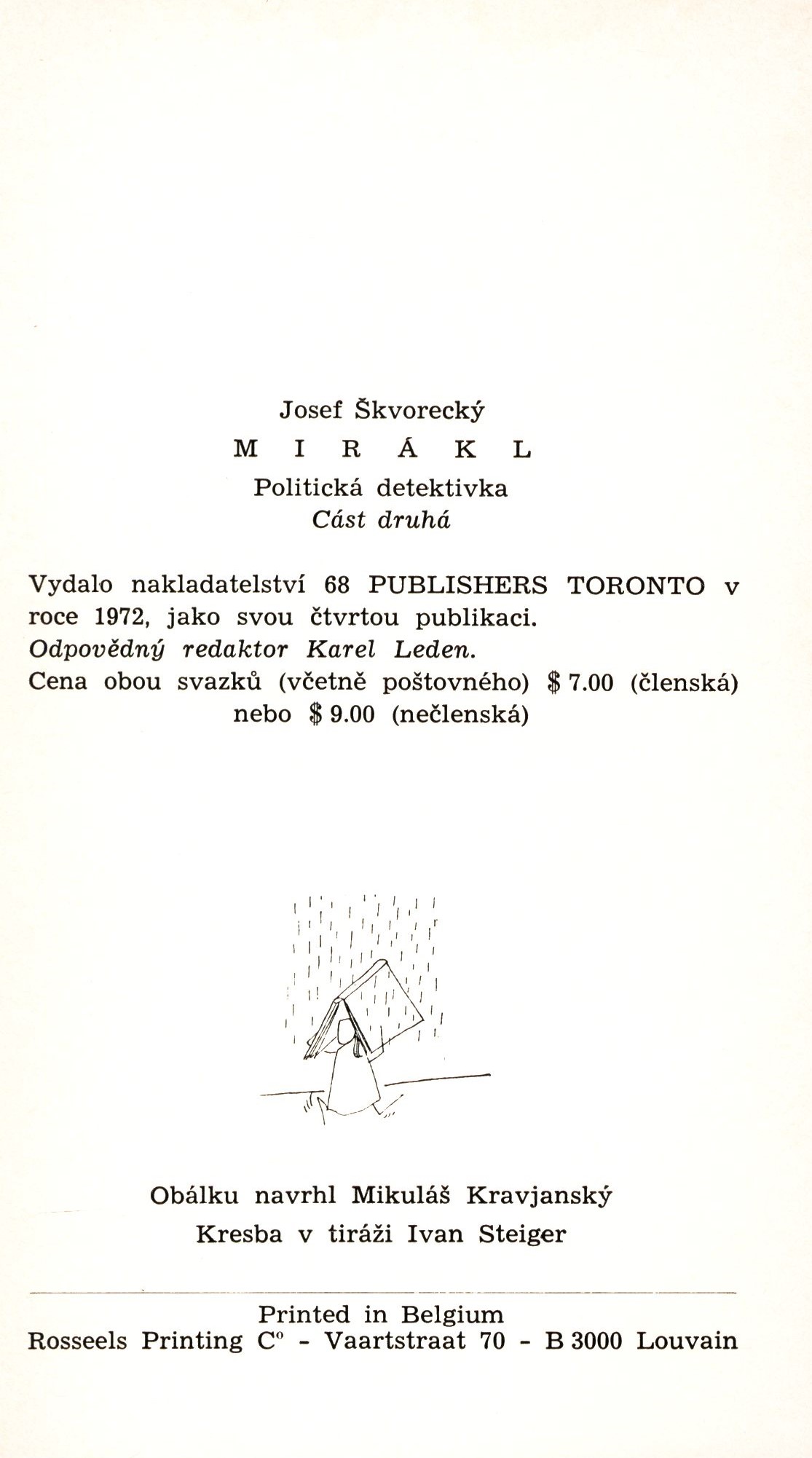 $a Mirákl : $b politická detektivka. $n [1.] / $c Josef Škvorecký ; obálku navrhl Mikuláš Kravjanský ; kresba v tiráži Ivan Steiger 264 -1