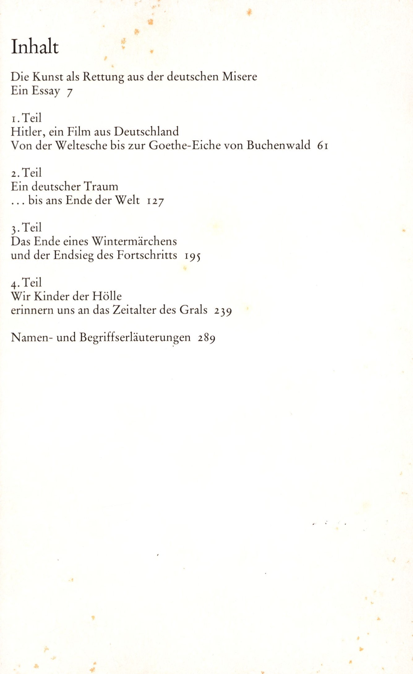 Title information Hitler, ein Film aus Deutschland / Hans-Jürgen Syberberg Personal name Syberberg, Hans Jürgen, (Author) 1935- Další autoři Rowohlt Verlag (nakladatelství) (Publisher) Clausen & Bosse (tiskárna) (Printer) Edition statement Erstausgabe Publication Reinbek bei Hamburg : Rowohlt, 1978 Manufacture Leck/Schleswig : Clausen & Bosse Scope 315 stran : ilustrace, portréty ; 19 cm ISBN 3-499-25108-6 (brožováno) Edition Das neue Buch