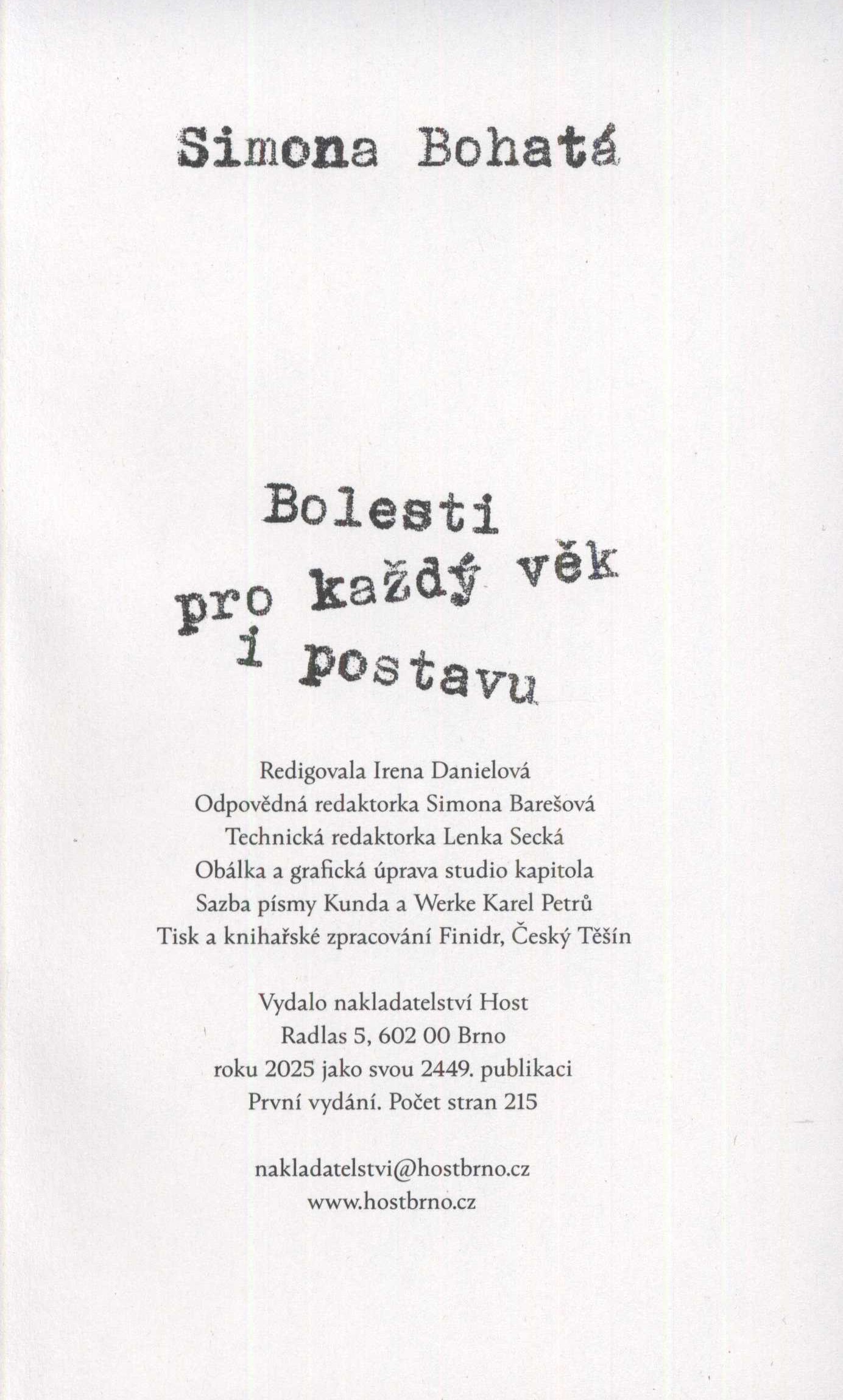 Bolesti pro každý věk i postavu / Simona Bohatá ; obálka a grafická úprava studio kapitola. -- První vydání. -- Brno : Host, 2025. -- Český Těšín : Finidr. -- 211 stran ; 21 cm. -- Zdobená barevná obálka. - Tmavě modré předsádky. - Rozložený, zdobený barevný patitul a titulní list. - Obsah. - Na zadním přídeští medailon autorky s tónovaným fotem. - Na zadní straně obálky anotace knihy. -- Scope and content: Sbírka psychologicky laděných povídek, ve kterých se opakují témata nejrůznějších traumat, starých tajemství a odcizení, přesto tito hlavní hrdinové mají touhu ještě naplno žít. Kosťa se vrací z vězení a času už mu moc nezbývá. Cíba s Fošnou nikdy pořádně makat nebudou, ať se z nich Rýma třeba zvencne. Tři Marie si u vyschlé studny vyřizují dávné účty a na silvestra možná všechno bouchne. Nejlíp je nakonec tomu nebohému kocourovi, který nemá o svém údělu ani ponětí. Všechno kolem se mění a jisté je jen to, že ne všem osud rozdal stejně dobré karty. Nakladatelská anotace. Kráceno. -- ISBN : 978-80-275-2285-9 (vázáno).