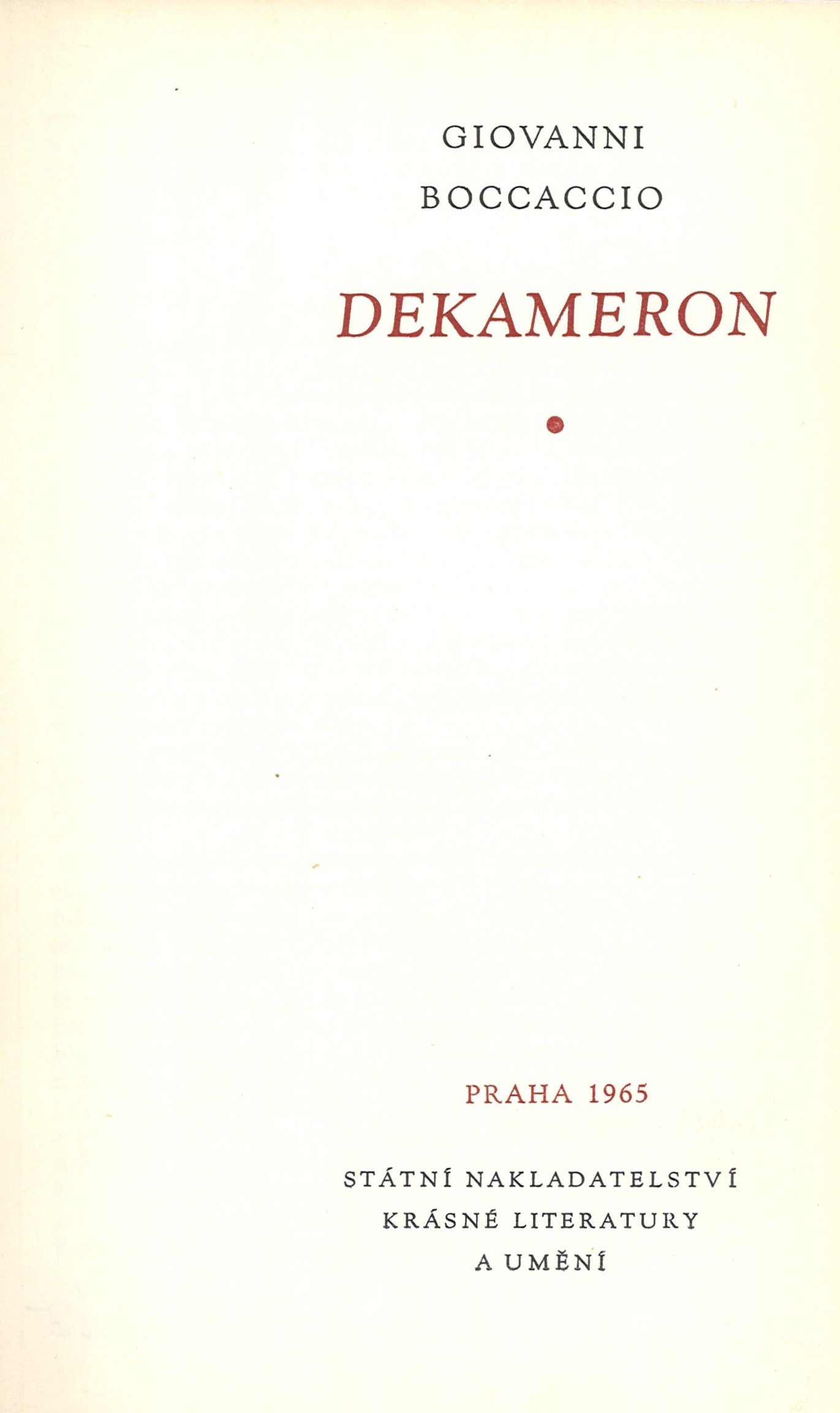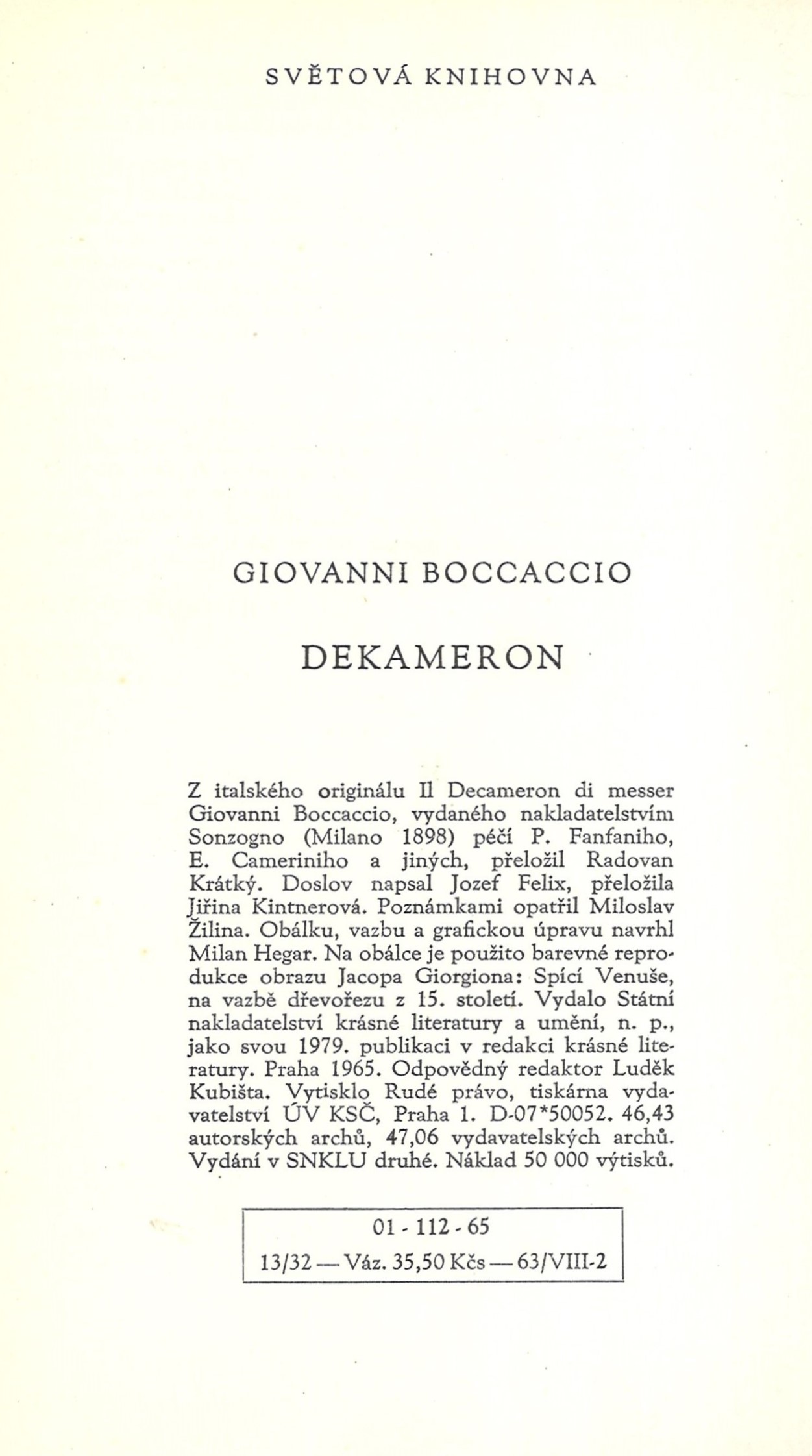 Světová knihovna (SNKLU)Country Czech Republic Language Czech Language of the original Italian Note Na obálce barevná reprodukce obrazu Spící Venuše, dvoubarevný text (i na hřbetu). - Na přední záložce o malíři obrazu, na zadní anotace knihy. - Červená plátěná vazba s černým přetiskem rytiny, zlatý text na hřbetu. - Dvoubarevný text na titulním listu. - Novely. - Autorův závěr. - Doslov "Boccacciův Dekameron" J. Felix. - Poznámky. - Obsah. - Přebal.