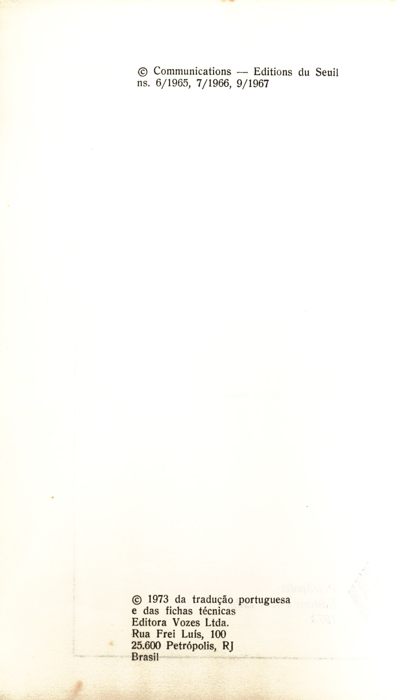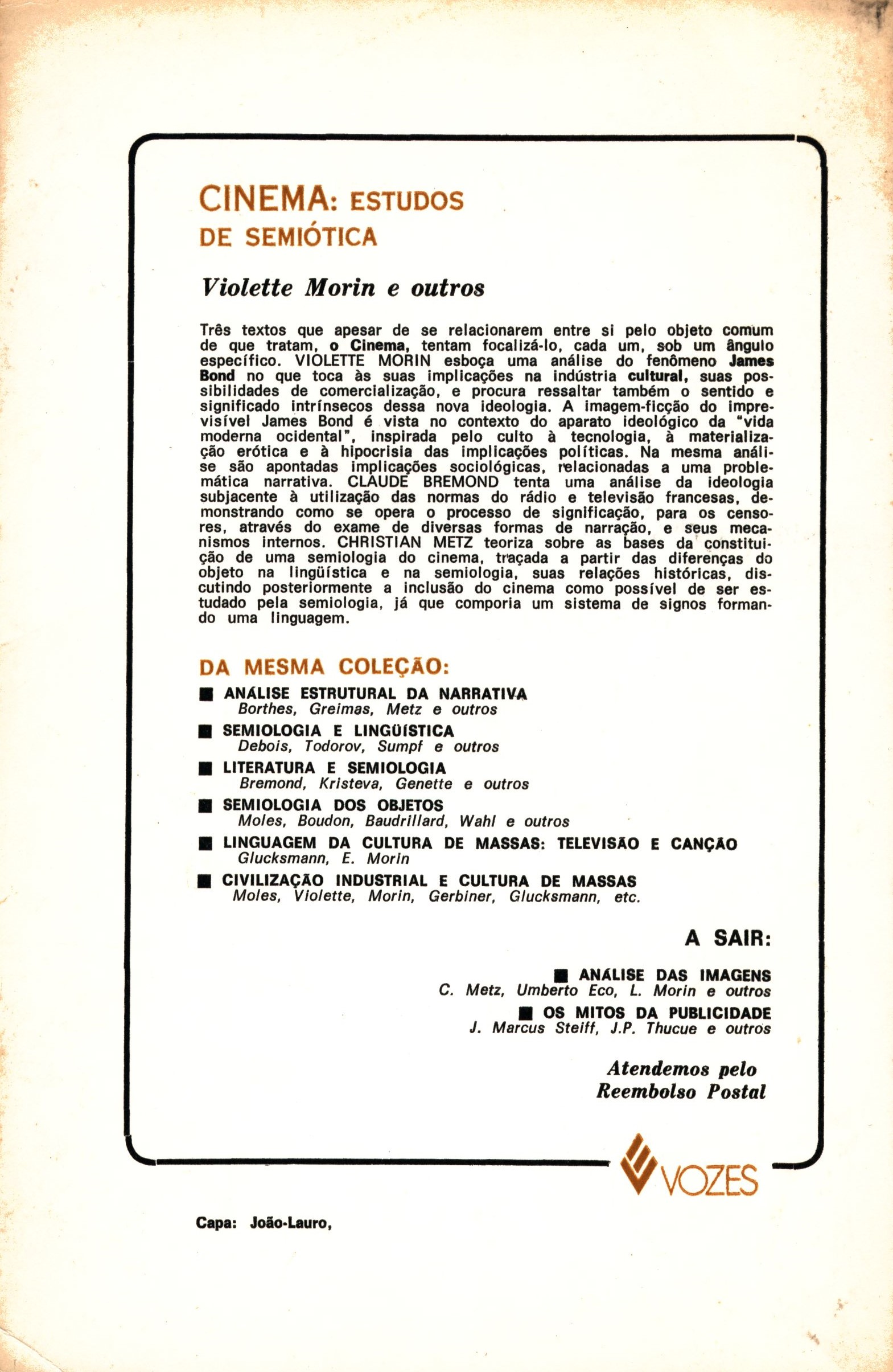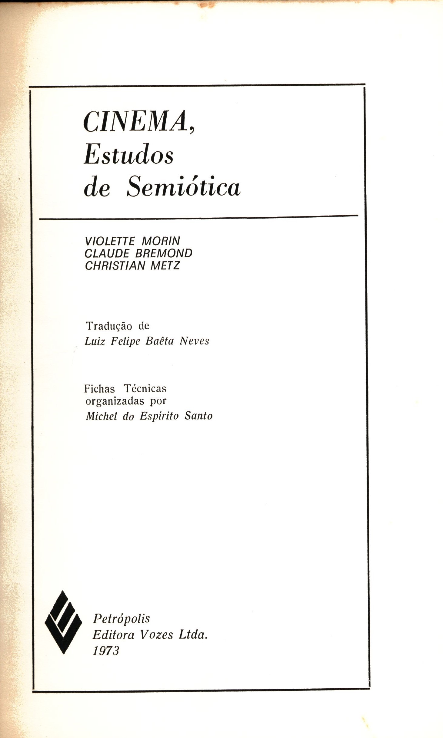 Title information Cinema : estudos de Semiótica / Violette Morin, Claude Bremond, Christian Metz ; tradução de Luiz Felipe Baêta Neves ; fichas Técnicas organizadas por Michel do Espírito Santo Personal name Morin, Violette (Author) Další autoři Bremond, Claude (Author) Metz, Christian (Author) Baêta Neves, Luiz Felipe (Translator) do Espírito Santo, Michel (Other) Corporation Editora Vozes (Publisher) (Printer) Publication Petrópolis : Editora Vozes, 1973 Scope 140 stran ; 21 cm ISBN (Vázáno) Country Brazil Language Portuguese Note Typografická obálka. - Poznámky pod čarou. - Anotace knihy na zadní obálce.
