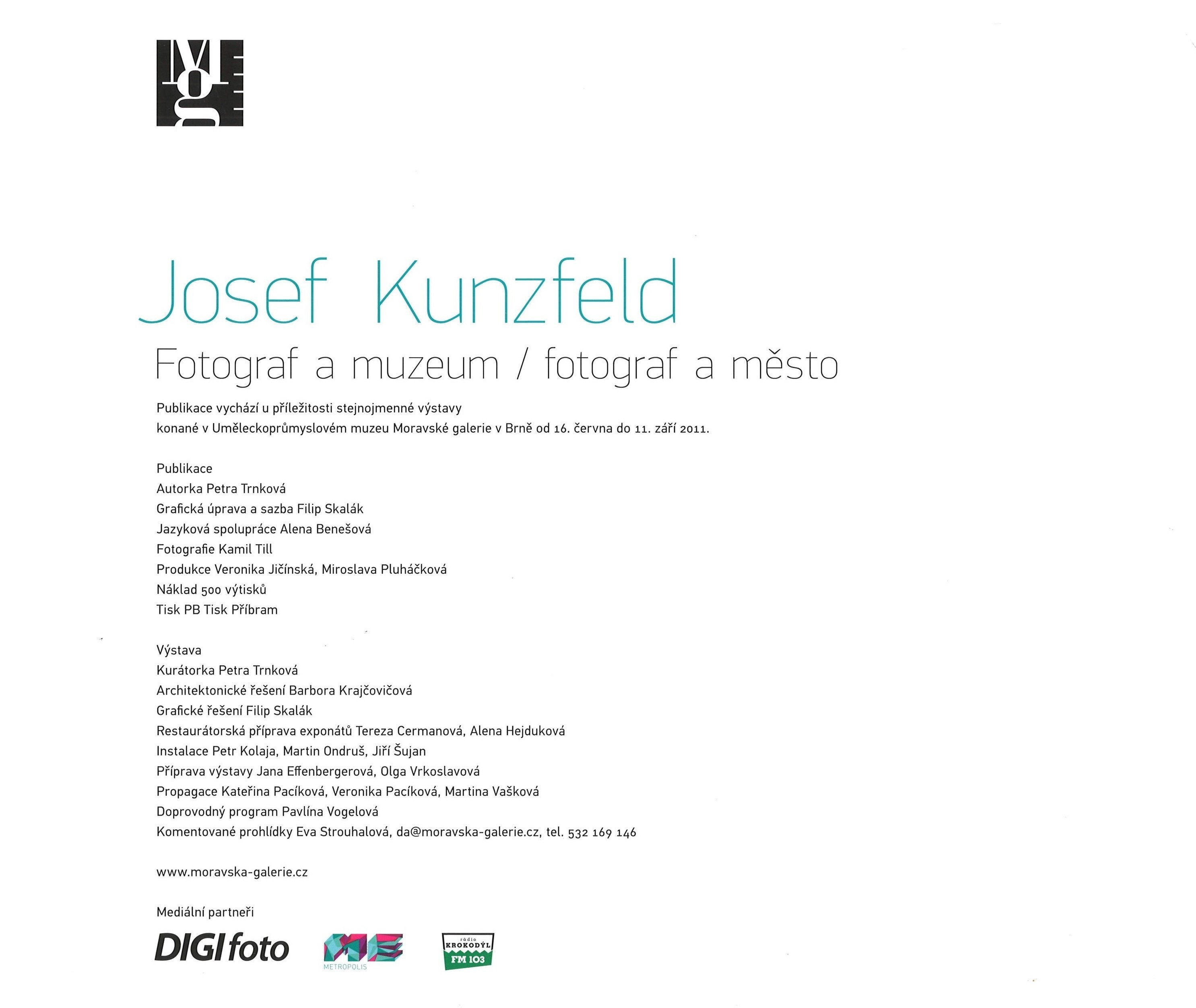 Title information Josef Kunzfeld : fotograf a muzeum - fotograf a město / Petra Trnková ; grafická úprava a sazba Filip Skalák ; fotografie Kamil Till Personal name Trnková, Petra, 1976- (Artist) Další autoři Skalák, Filip, 1972- (Book designer) (Compositor) Till, Kamil, 1960- (Photographer) Corporation Moravská galerie (Brno, Česko) (Publisher) PBtisk (tiskárna) (Printer) Publication Brno : Moravská galerie, 2011 Manufacture Příbram : PB Tisk Scope 15 stran, 33 nečíslovaných stran obrazových příloh : barevné ilustrace, portréty ; 24 x 28 cm ISBN 978-80-7027-232-9 (brožováno) Country Czech Republic Language Czech Note Zdobená tónovaná obálka. - Černobílé fotografie na předsádkách. - Barevné a tónované fotografie s popiskami převážně v obrazové příloze, některé v textu. - 500 výtisků.
