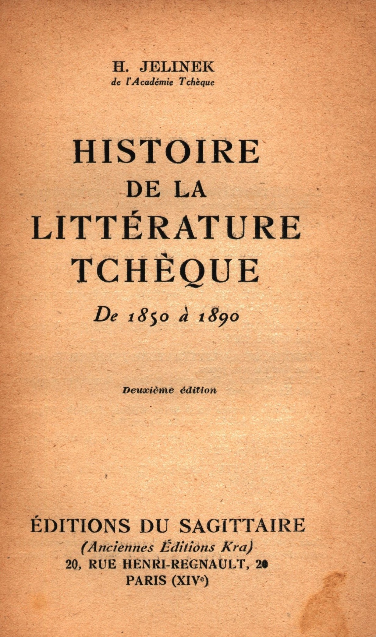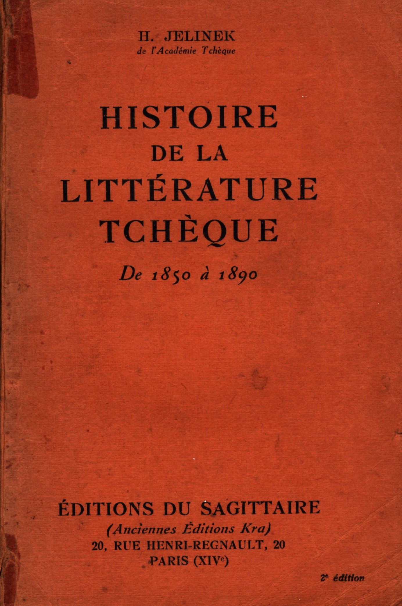 Title information Histoire de la littérature tchèque : de 1850 à 1890 / H. Jelinek de l'Académie Tchèque Personal name Jelínek, Hanuš, 1878-1944 (Author) Další autoři Sagittaire (firma) (Publisher) Établissements Busson (tiskárna) (Printer) Edition statement Deuxième édition Publication Paris : Sagittaire, [1933] Manufacture Établissements Busson Scope 359 stran ; 19 cm ISBN (Brožováno) Country France Language French Note Oranžová typografická obálka. - Informace o dalších dílech autora.
