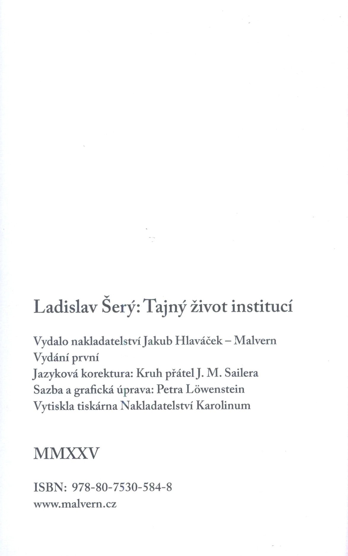 Title information Tajný život institucí / Ladislav Šerý ; sazba a grafická úprava Petra Löwenstein Personal name Šerý, Ladislav, 1958- (Author) Další autoři Löwenstein, Petra (Compositor) (Book designer) Corporation Malvern (nakladatelství) (Publisher) Tiskárna nakladatelství Karolinum (Printer) Edition statement Vydání první Publication Praha : Malvern, 2025 Manufacture tiskárna Nakladatelství Karolinum Scope 195 stran ; 17 cm ISBN 978-80-7530-584-8 (brožováno) Country Czech Republic Language Czech Note Zdobená barevná obálka. - Obsah. - Na zadní straně obálky anotace knihy.