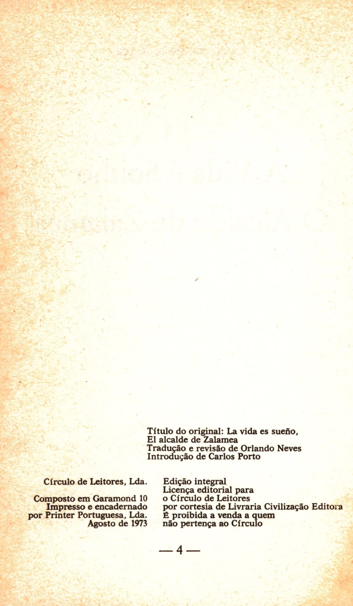 Title information A Vida é Sonho ; O Alcaide de Zalamea / Calderón de la Barca Personal name Calderón de la Barca, Pedro, 1600-1681 (Author) Další autoři Círculo de Leitores (Publisher) Printer Portuguesa (Printer) Publication [místo vydání není známé] : Círculo de Leitores, [1973] Manufacture Printer Portuguesa Scope 256 stran ; 18 cm ISBN (Vázáno) Country Portugal Language Portuguese Note Zdobená obálka. - Poznámka o autorovi