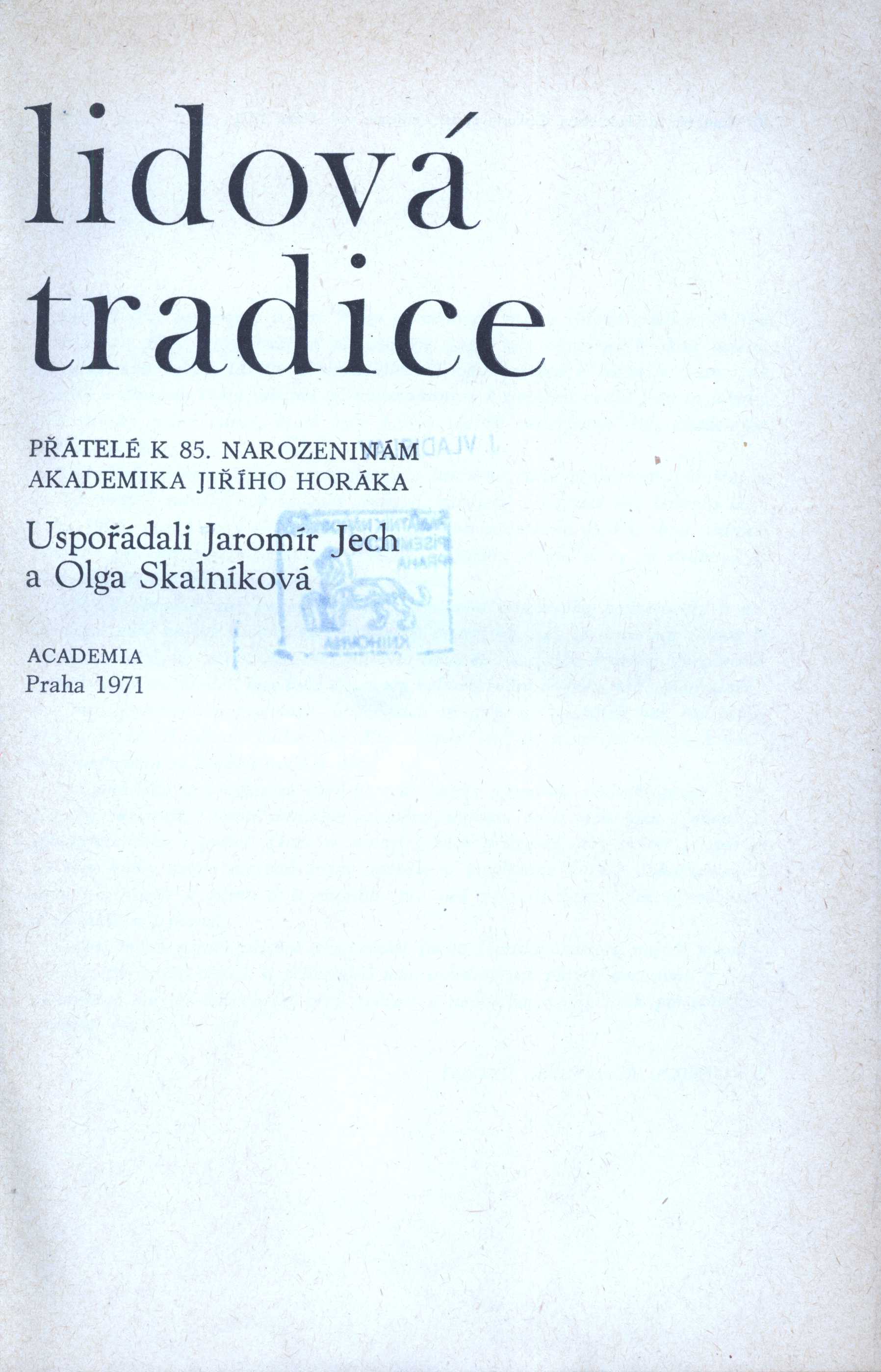 $a Lidová tradice : $b přátelé k 85. narozeninám akademika Jiřího Horáka : soubor statí / $c uspořádali Jaromír Jech a Olga Skalníková